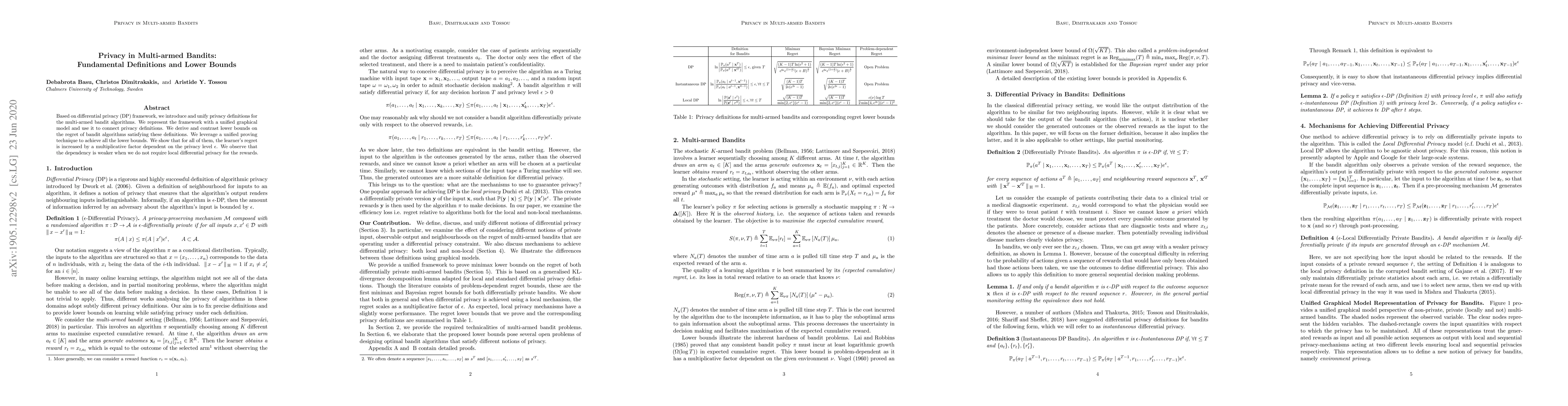Based on differential privacy (DP) framework, we introduce and unify privacy definitions for the multi-armed bandit algorithms. We represent the framework with a unified graphical model and use it to connect privacy definitions. We derive and contrast lower bounds on the regret of bandit algorithms satisfying these definitions. We leverage a unified proving technique to achieve all the lower bounds. We show that for all of them, the learner's regret is increased by a multiplicative factor dependent on the privacy level $\epsilon$. We observe that the dependency is weaker when we do not require local differential privacy for the rewards.