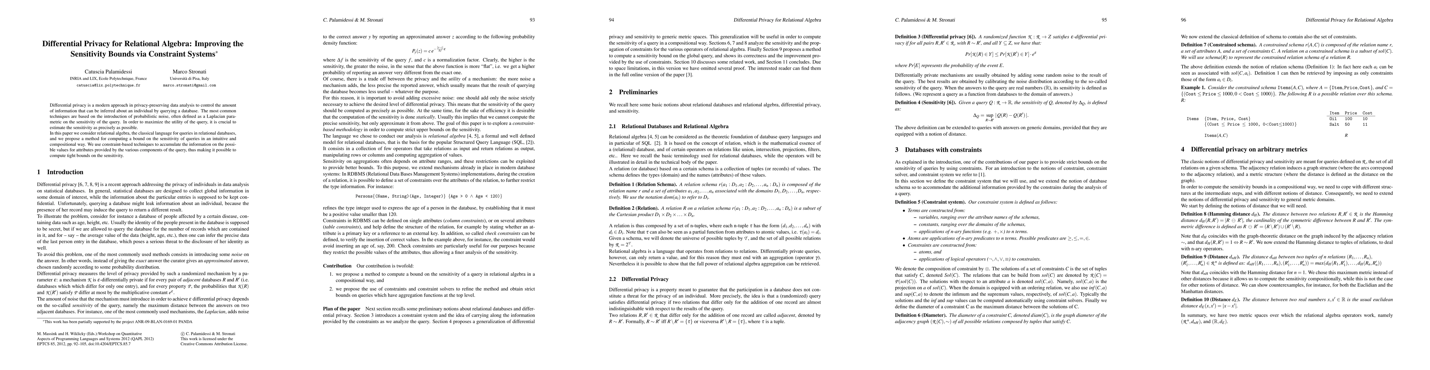 This paper proposes a method to compute tighter bounds on the sensitivity of queries in relational algebra using constraint-based techniques, aiming to improve differential privacy by more precisely estimating the sensitivity and thus maximizing query utility. The method leverages accumulated information from query components to achieve more accurate sensitivity estimates.