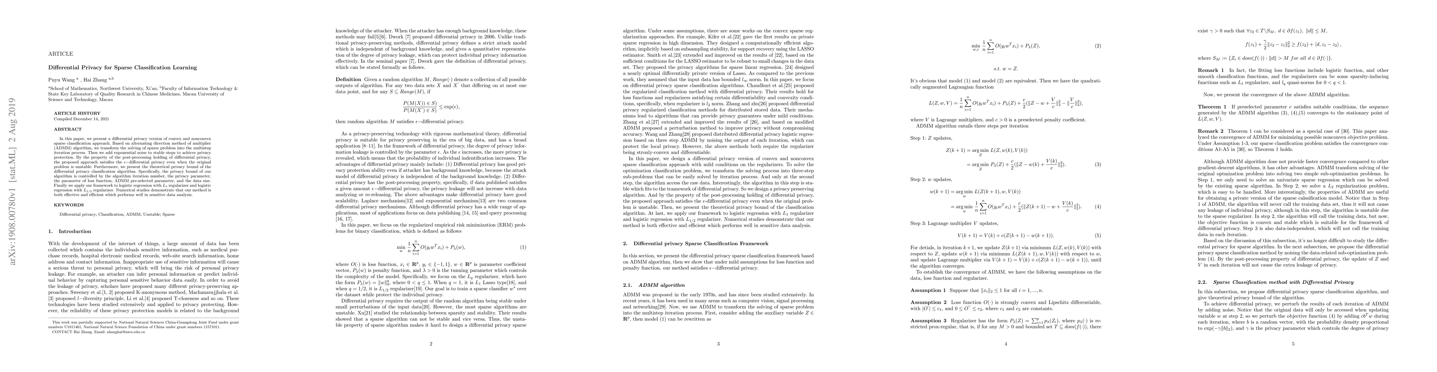 In this paper, we present a differential privacy version of convex and nonconvex sparse classification approach. Based on alternating direction method of multiplier (ADMM) algorithm, we transform the solving of sparse problem into the multistep iteration process. Then we add exponential noise to stable steps to achieve privacy protection. By the property of the post-processing holding of differential privacy, the proposed approach satisfies the $\epsilon-$differential privacy even when the original problem is unstable. Furthermore, we present the theoretical privacy bound of the differential privacy classification algorithm. Specifically, the privacy bound of our algorithm is controlled by the algorithm iteration number, the privacy parameter, the parameter of loss function, ADMM pre-selected parameter, and the data size. Finally we apply our framework to logistic regression with $L_1$ regularizer and logistic regression with $L_{1/2}$ regularizer. Numerical studies demonstrate that our method is both effective and efficient which performs well in sensitive data analysis.