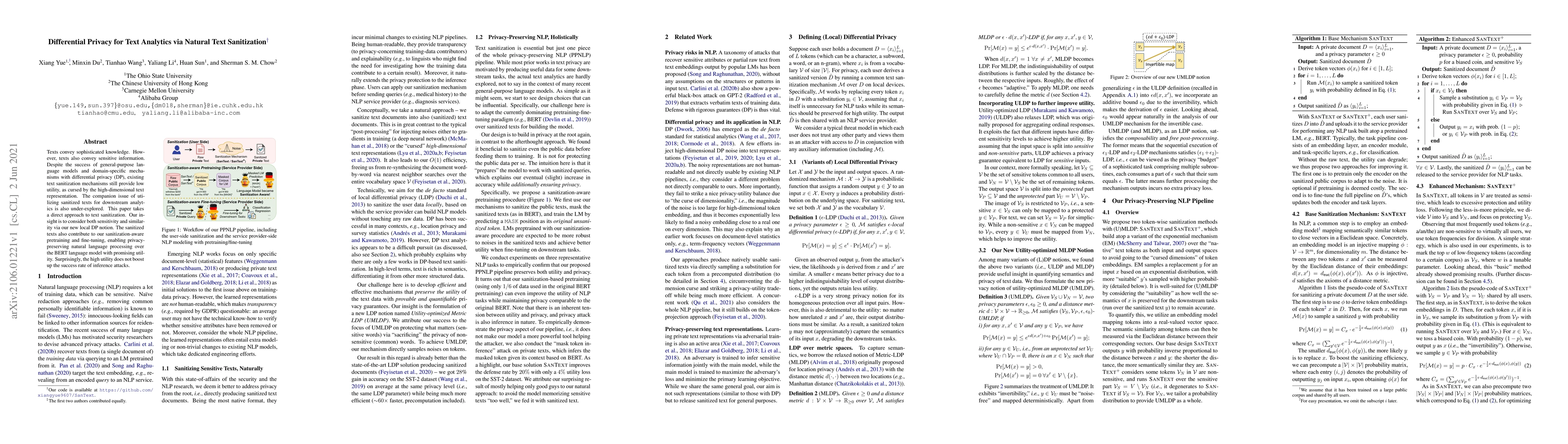 Texts convey sophisticated knowledge. However, texts also convey sensitive information. Despite the success of general-purpose language models and domain-specific mechanisms with differential privacy (DP), existing text sanitization mechanisms still provide low utility, as cursed by the high-dimensional text representation. The companion issue of utilizing sanitized texts for downstream analytics is also under-explored. This paper takes a direct approach to text sanitization. Our insight is to consider both sensitivity and similarity via our new local DP notion. The sanitized texts also contribute to our sanitization-aware pretraining and fine-tuning, enabling privacy-preserving natural language processing over the BERT language model with promising utility. Surprisingly, the high utility does not boost up the success rate of inference attacks.
