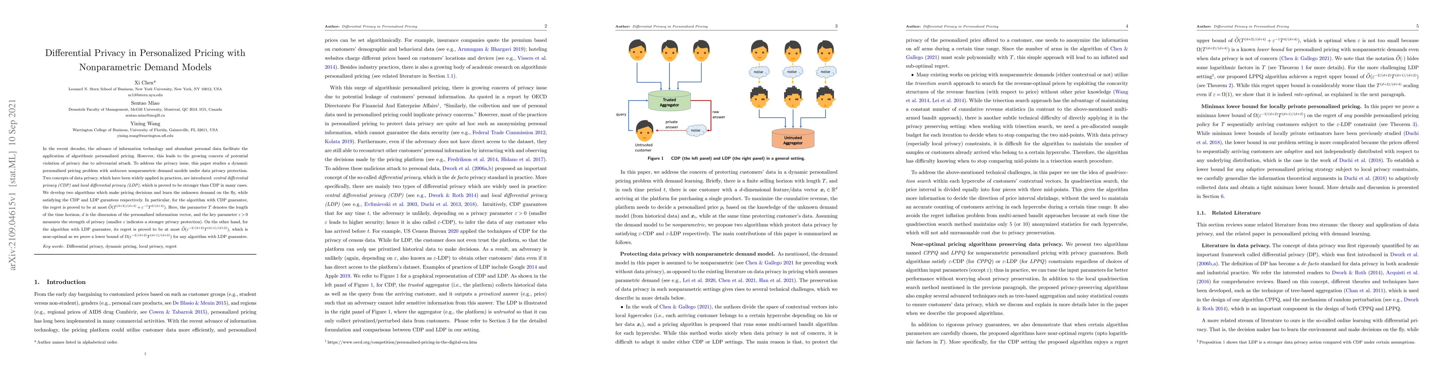 This paper explores dynamic personalized pricing under unknown nonparametric demand models while ensuring data privacy through central and local differential privacy. It develops two algorithms that satisfy either central or local differential privacy, achieving regret bounds that depend on the time horizon length, dimensionality of personalized information, and privacy strength parameter.