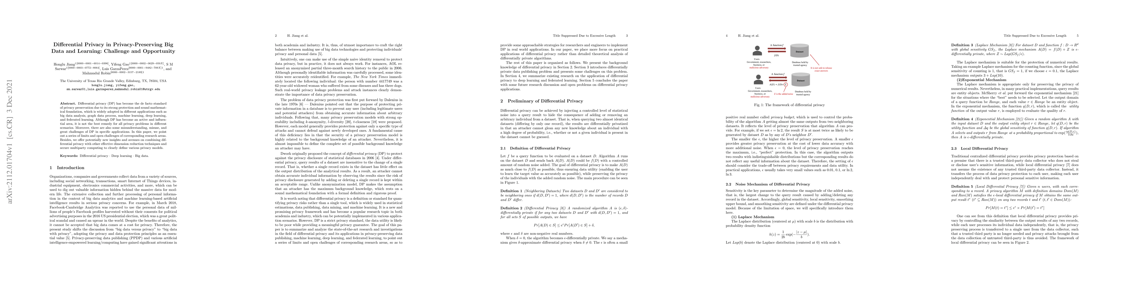 This paper discusses the strengths and limitations of differential privacy (DP) in privacy-preserving big data and learning, highlighting its challenges and misuse in specific applications. It proposes new insights and avenues for combining DP with dimension reduction techniques and secure multiparty computing to better define various privacy models.