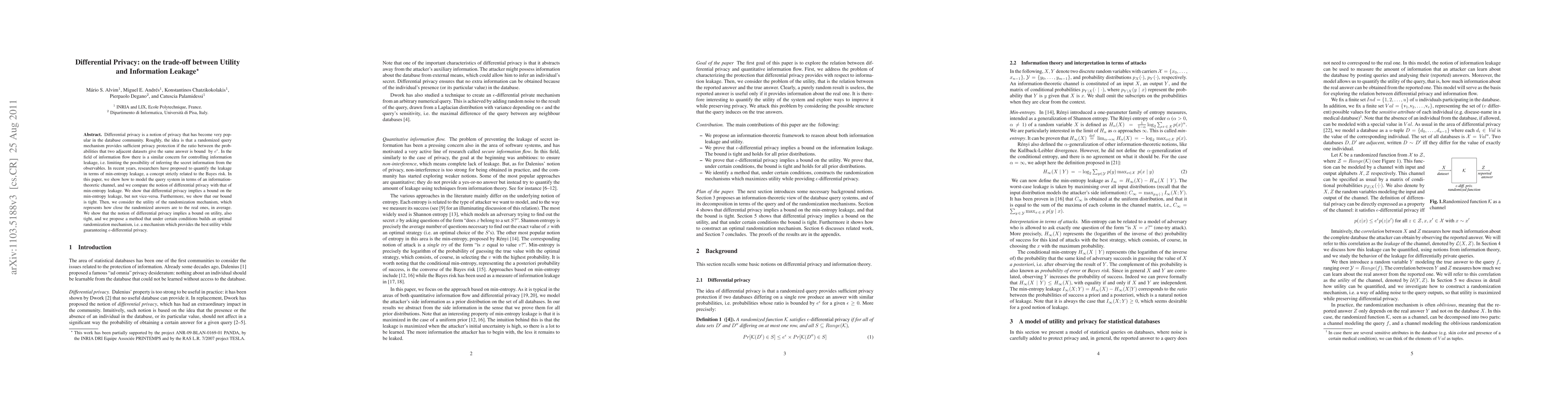 This paper explores the relationship between differential privacy and information leakage, demonstrating that differential privacy imposes a tight bound on mutual information. It also investigates the utility of randomized query mechanisms, proposing an optimal method to balance privacy and utility under certain conditions.