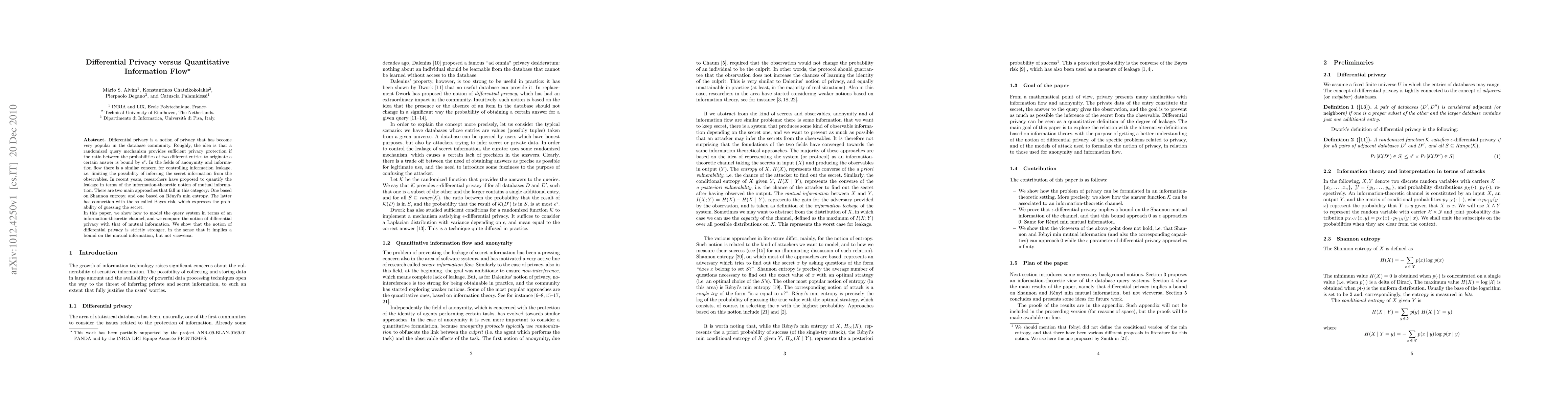 This paper compares differential privacy with quantitative information flow, showing that differential privacy provides stronger privacy guarantees by implying a bound on mutual information, whereas mutual information does not necessarily imply differential privacy. The study models query systems as information-theoretic channels to elucidate these differences.
