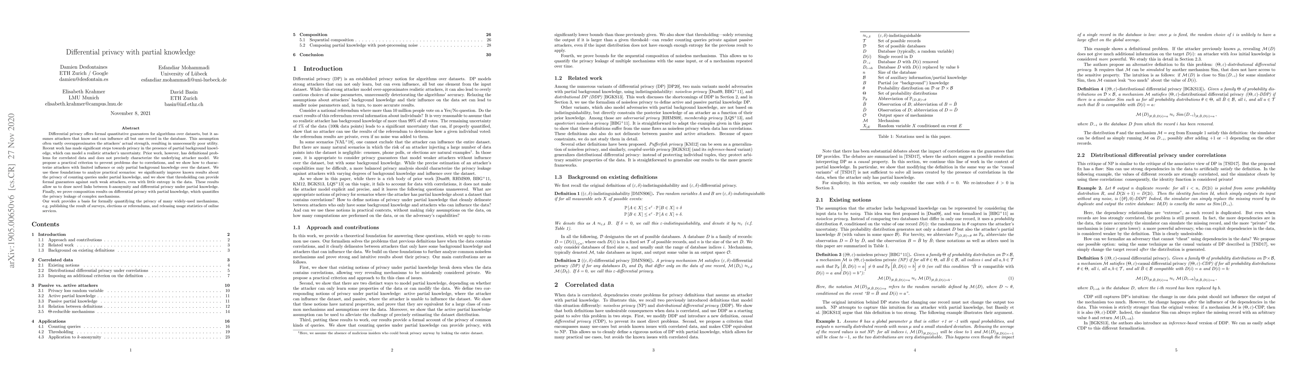 Differential privacy offers formal quantitative guarantees for algorithms over datasets, but it assumes attackers that know and can influence all but one record in the database. This assumption often vastly overapproximates the attackers' actual strength, resulting in unnecessarily poor utility. Recent work has made significant steps towards privacy in the presence of partial background knowledge, which can model a realistic attacker's uncertainty. Prior work, however, has definitional problems for correlated data and does not precisely characterize the underlying attacker model. We propose a practical criterion to prevent problems due to correlations, and we show how to characterize attackers with limited influence or only partial background knowledge over the dataset. We use these foundations to analyze practical scenarios: we significantly improve known results about the privacy of counting queries under partial knowledge, and we show that thresholding can provide formal guarantees against such weak attackers, even with little entropy in the data. These results allow us to draw novel links between k-anonymity and differential privacy under partial knowledge. Finally, we prove composition results on differential privacy with partial knowledge, which quantifies the privacy leakage of complex mechanisms. Our work provides a basis for formally quantifying the privacy of many widely-used mechanisms, e.g. publishing the result of surveys, elections or referendums, and releasing usage statistics of online services.