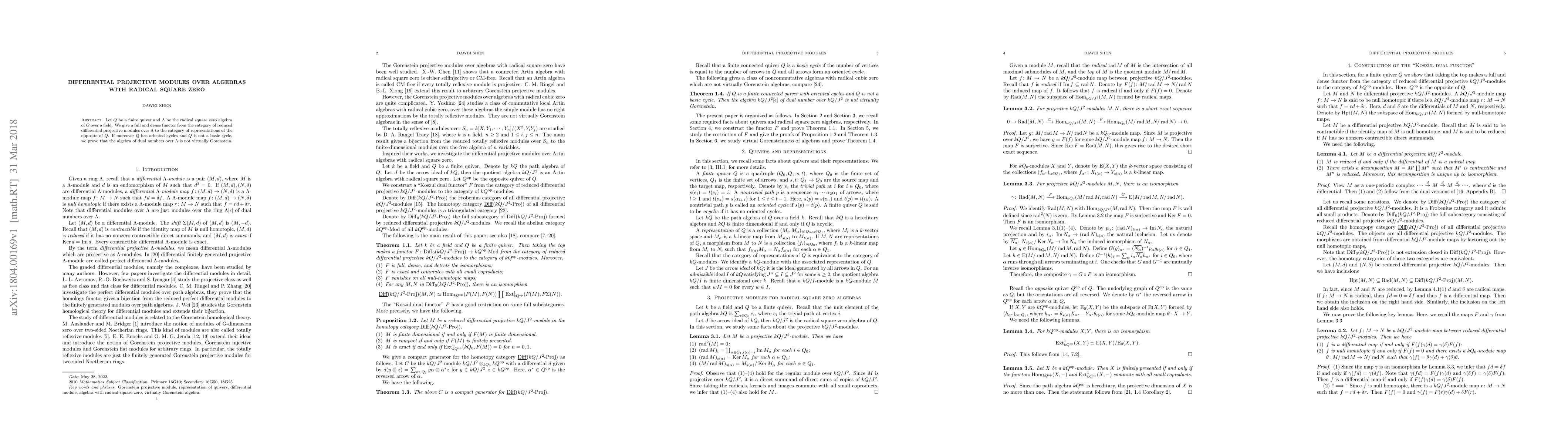 Summary: This paper explores differential projective modules over algebras derived from finite quivers with radical square zero, establishing a functor connecting these modules to quiver representations. It also proves that if the quiver contains oriented cycles and is not basic, the dual number algebra over $\Lambda$ fails to be virtually Gorenstein.