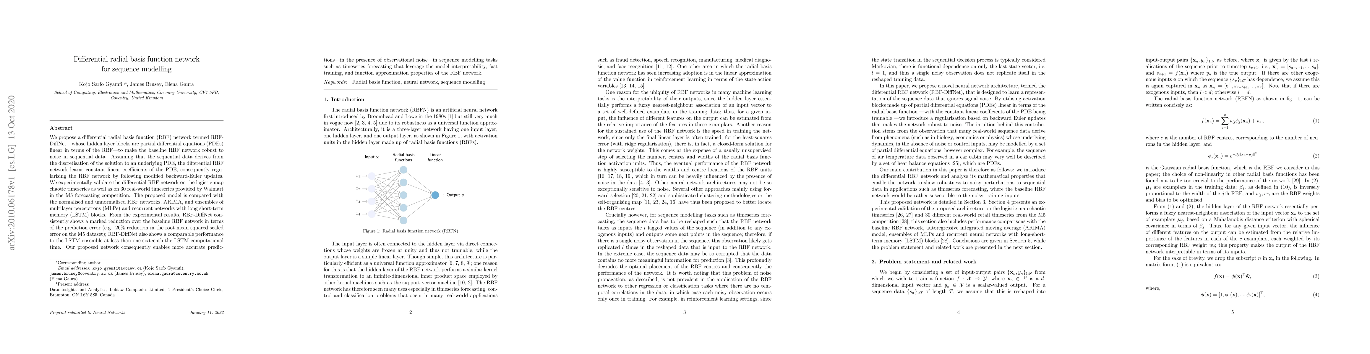 We propose a differential radial basis function (RBF) network termed RBF-DiffNet -- whose hidden layer blocks are partial differential equations (PDEs) linear in terms of the RBF -- to make the baseline RBF network robust to noise in sequential data. Assuming that the sequential data derives from the discretisation of the solution to an underlying PDE, the differential RBF network learns constant linear coefficients of the PDE, consequently regularising the RBF network by following modified backward-Euler updates. We experimentally validate the differential RBF network on the logistic map chaotic timeseries as well as on 30 real-world timeseries provided by Walmart in the M5 forecasting competition. The proposed model is compared with the normalised and unnormalised RBF networks, ARIMA, and ensembles of multilayer perceptrons (MLPs) and recurrent networks with long short-term memory (LSTM) blocks. From the experimental results, RBF-DiffNet consistently shows a marked reduction over the baseline RBF network in terms of the prediction error (e.g., 26% reduction in the root mean squared scaled error on the M5 dataset); RBF-DiffNet also shows a comparable performance to the LSTM ensemble at less than one-sixteenth the LSTM computational time. Our proposed network consequently enables more accurate predictions -- in the presence of observational noise -- in sequence modelling tasks such as timeseries forecasting that leverage the model interpretability, fast training, and function approximation properties of the RBF network.