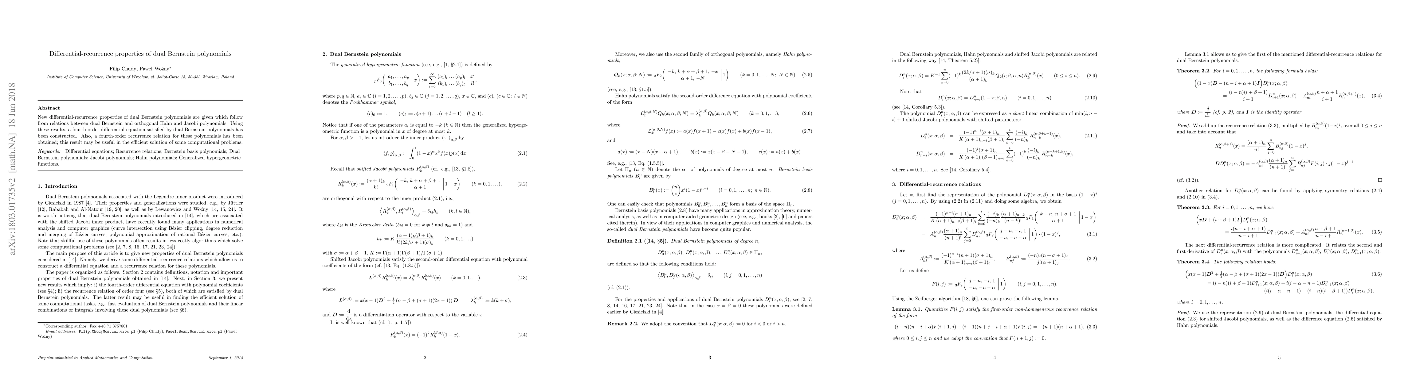 This paper presents new differential-recurrence properties of dual Bernstein polynomials derived from their connections to orthogonal Hahn and Jacobi polynomials. It constructs a fourth-order differential equation and a recurrence relation for these polynomials, potentially aiding computational efficiency in related problems.