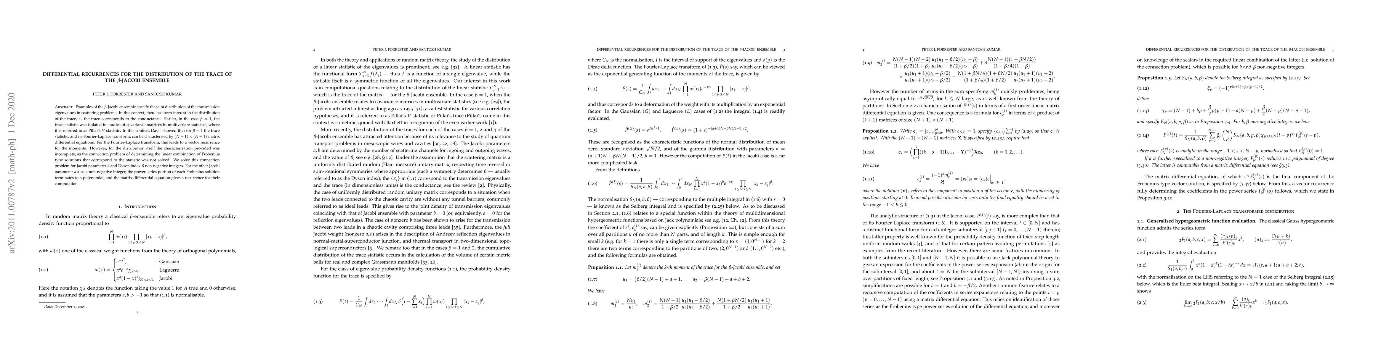 Examples of the $\beta$-Jacobi ensemble specify the joint distribution of the transmission eigenvalues in scattering problems. In this context, there has been interest in the distribution of the trace, as the trace corresponds to the conductance. Earlier, in the case $\beta = 1$, the trace statistic was isolated in studies of covariance matrices in multivariate statistics, where it is referred to as Pillai's $V$ statistic. In this context, Davis showed that for $\beta = 1$ the trace statistic, and its Fourier-Laplace transform, can be characterised by $(N+1) \times (N+1)$ matrix differential equations. For the Fourier-Laplace transform, this leads to a vector recurrence for the moments. However, for the distribution itself the characterisation provided was incomplete, as the connection problem of determining the linear combination of Frobenius type solutions that correspond to the statistic was not solved. We solve this connection problem for Jacobi parameter $b$ and Dyson index $\beta$ non-negative integers. For the other Jacobi parameter $a$ also a non-negative integer, the power series portion of each Frobenius solution terminates to a polynomial, and the matrix differential equation gives a recurrence for their computation.