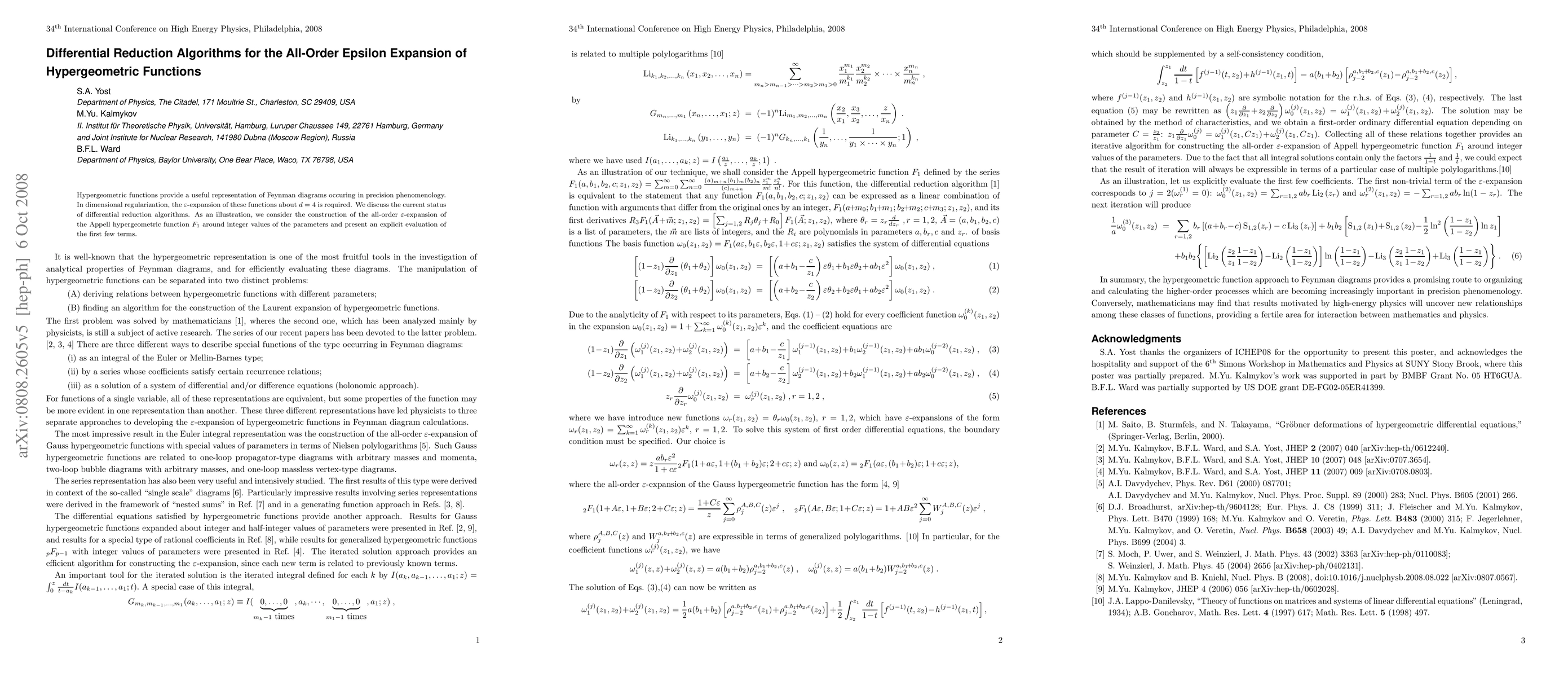 Hypergeometric functions provide a useful representation of Feynman diagrams occuring in precision phenomenology. In dimension regularization, the epsilon-expansion of these functions about d=4 is required. We discuss the current status of differential reduction algorithms. As an illustration, we consider the construction of the all-order epsilon-expansion of the Appell hypergeometric function about integer values of the parameters and present an explicit evaluations of the first few terms.
