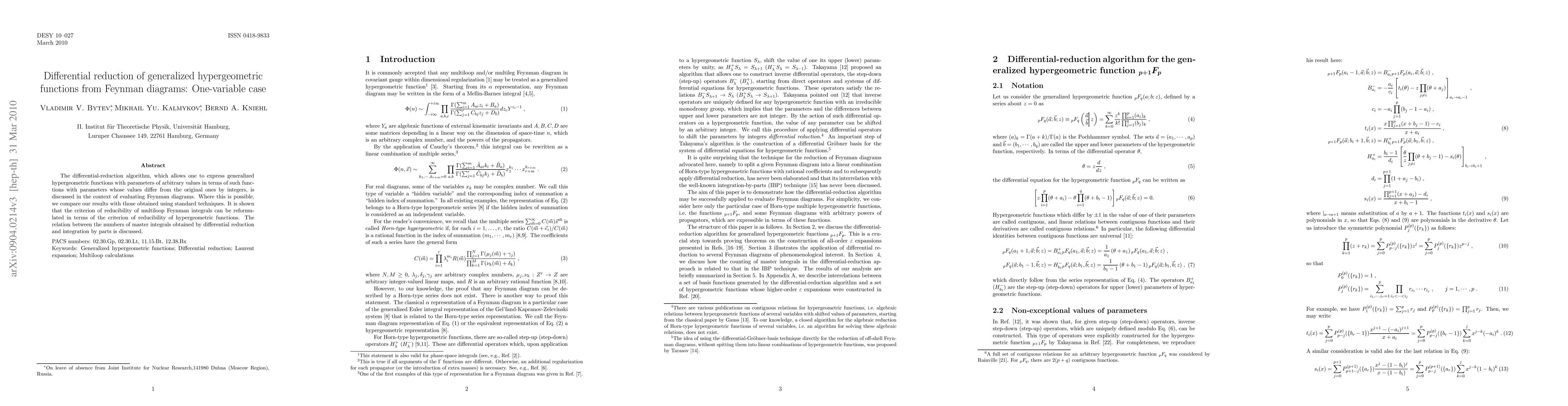 This paper discusses the differential-reduction algorithm for generalized hypergeometric functions, showing its application in evaluating Feynman diagrams and comparing it with standard techniques. It reformulates the criterion for reducibility of multiloop Feynman integrals in terms of hypergeometric functions and explores the relation between master integrals obtained through differential reduction and integration by parts.