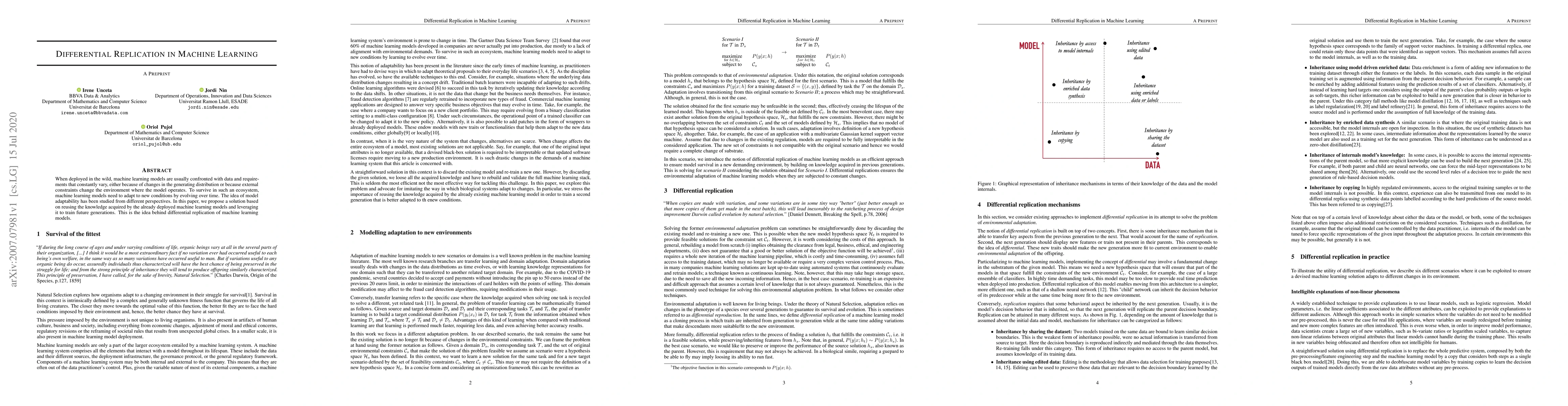 When deployed in the wild, machine learning models are usually confronted with data and requirements that constantly vary, either because of changes in the generating distribution or because external constraints change the environment where the model operates. To survive in such an ecosystem, machine learning models need to adapt to new conditions by evolving over time. The idea of model adaptability has been studied from different perspectives. In this paper, we propose a solution based on reusing the knowledge acquired by the already deployed machine learning models and leveraging it to train future generations. This is the idea behind differential replication of machine learning models.