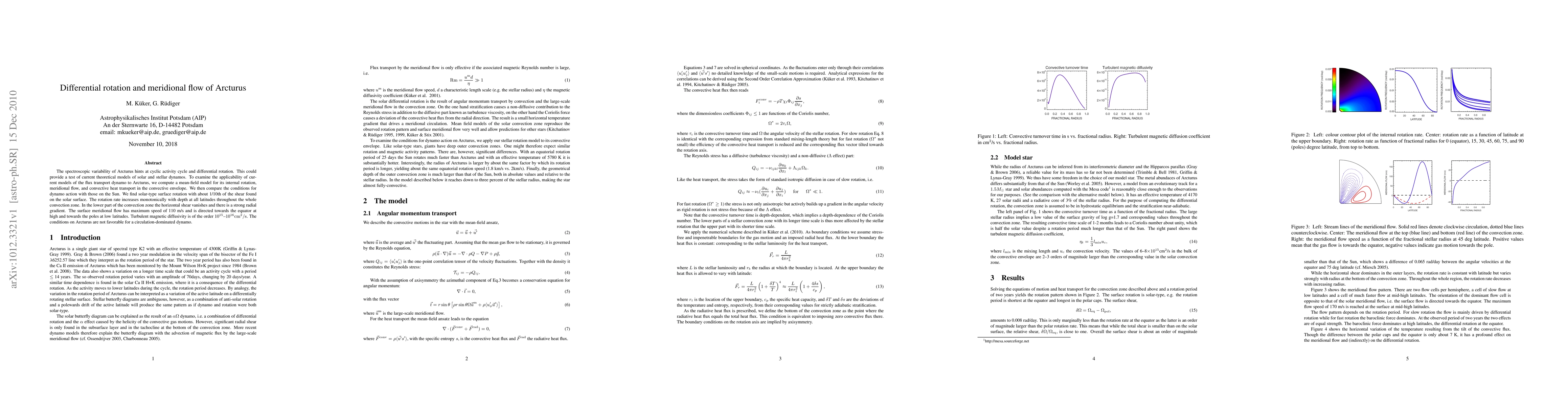 This study investigates Arcturus' differential rotation and meridional flow, comparing it to solar dynamo models. Results show solar-type surface rotation with less shear, increasing rotation with depth, and equator-directed meridional flow, concluding that Arcturus' conditions are not conducive to a circulation-dominated dynamo.