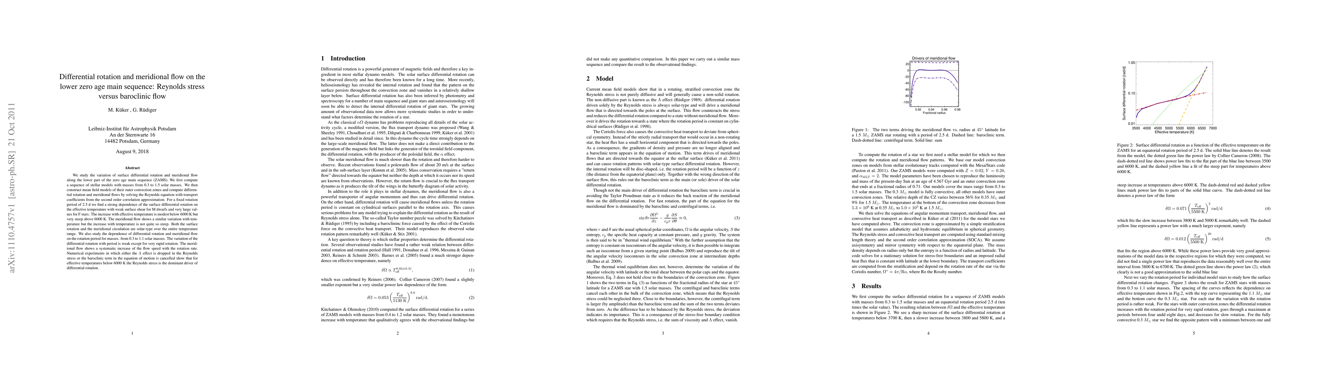 This paper investigates the differential rotation and meridional flow in lower zero age main sequence stars, finding strong dependence on effective temperature with significant variations for F stars. The Reynolds stress is the dominant driver of differential rotation below 6000 K, while meridional flow increases systematically with rotation rate.