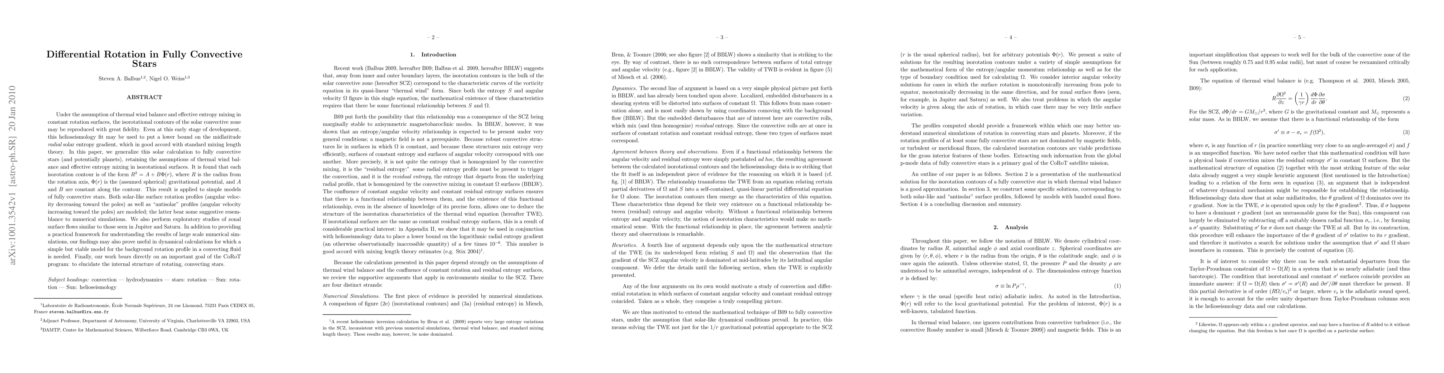 Under the assumption of thermal wind balance and effective entropy mixing in constant rotation surfaces, the isorotational contours of the solar convective zone may be reproduced with great fidelity. Even at this early stage of development, this helioseismology fit may be used to put a lower bound on the midlatitude {\em radial} solar entropy gradient, which in good accord with standard mixing length theory. In this paper, we generalize this solar calculation to fully convective stars (and potentially planets), retaining the assumptions of thermal wind balance and effective entropy mixing in isorotational surfaces. It is found that each isorotation contour is of the form $R^2 = A+B\Phi(r)$, where $R$ is the radius from the rotation axis, $\Phi(r)$ is the (assumed spherical) gravitational potential, and $A$ and $B$ are constant along the contour. This result is applied to simple models of fully convective stars. Both solar-like surface rotation profiles (angular velocity decreasing toward the poles) as well as "antisolar" profiles (angular velocity increasing toward the poles) are modeled; the latter bear some suggestive resemblance to numerical simulations. We also perform exploratory studies of zonal surface flows similar to those seen in Jupiter and Saturn. In addition to providing a practical framework for understanding the results of large scale numerical simulations, our findings may also prove useful in dynamical calculations for which a simple but viable model for the background rotation profile in a convecting fluid is needed. Finally, our work bears directly on an important goal of the CoRoT program: to elucidate the internal structure of rotating, convecting stars.