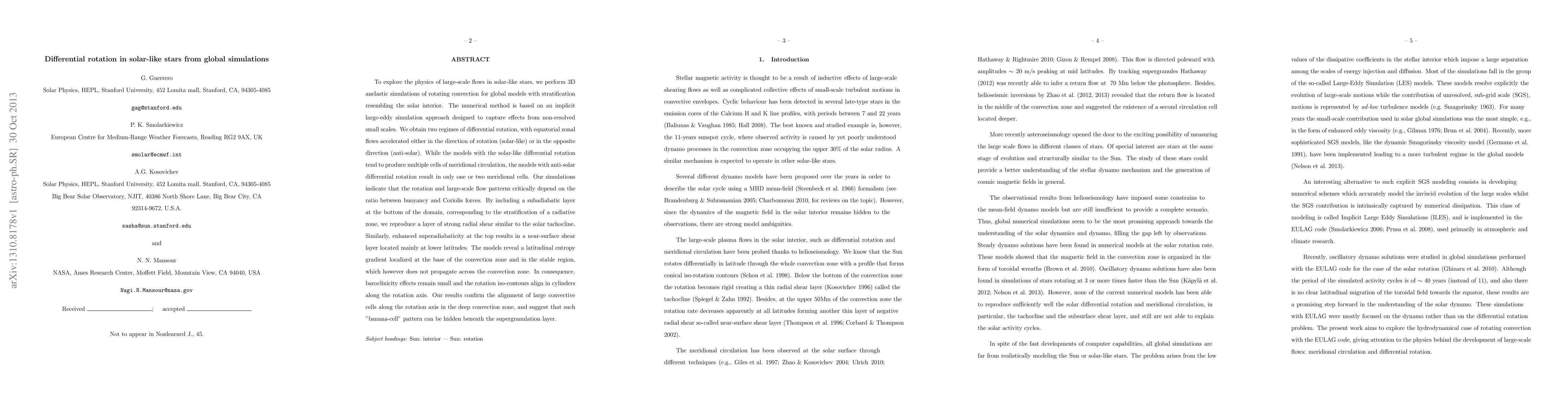 To explore the physics of large-scale flows in solar-like stars, we perform 3D anelastic simulations of rotating convection for global models with stratification resembling the solar interior. The numerical method is based on an implicit large-eddy simulation approach designed to capture effects from non-resolved small scales. We obtain two regimes of differential rotation, with equatorial zonal flows accelerated either in the direction of rotation (solar-like) or in the opposite direction (anti-solar). While the models with the solar-like differential rotation tend to produce multiple cells of meridional circulation, the models with anti-solar differential rotation result in only one or two meridional cells. Our simulations indicate that the rotation and large-scale flow patterns critically depend on the ratio between buoyancy and Coriolis forces. By including a subadiabatic layer at the bottom of the domain, corresponding to the stratification of a radiative zone, we reproduce a layer of strong radial shear similar to the solar tachocline. Similarly, enhanced superadiabaticity at the top results in a near-surface shear layer located mainly at lower latitudes. The models reveal a latitudinal entropy gradient localized at the base of the convection zone and in the stable region, which however does not propagate across the convection zone. In consequence, baroclinicity effects remain small and the rotation iso-contours align in cylinders along the rotation axis. Our results confirm the alignment of large convective cells along the rotation axis in the deep convection zone, and suggest that such "banana-cell" pattern can be hidden beneath the supergranulation layer.