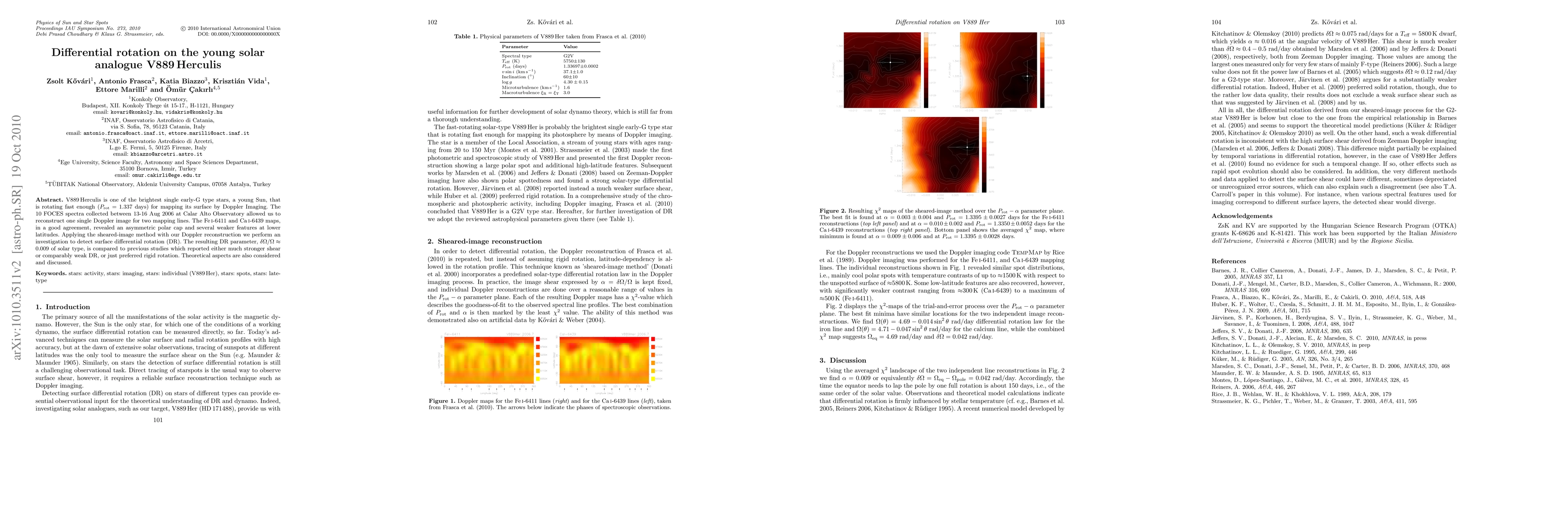 V889 Herculis is one of the brightest single early-G type stars, a young Sun, that is rotating fast enough (P_rot =1.337 days) for mapping its surface by Doppler Imaging. The 10 FOCES spectra collected between 13-16 Aug 2006 at Calar Alto Observatory allowed us to reconstruct one single Doppler image for two mapping lines. The FeI-6411 and CaI-6439 maps, in a good agreement, revealed an asymmetric polar cap and several weaker features at lower latitudes. Applying the sheared-image method with our Doppler reconstruction we perform an investigation to detect surface differential rotation (DR). The resulting DR parameter, deltaOmega/Omega~0.009 of solar type, is compared to previous studies which reported either much stronger shear or comparably weak DR, or just preferred rigid rotation. Theoretical aspects are also considered and discussed.