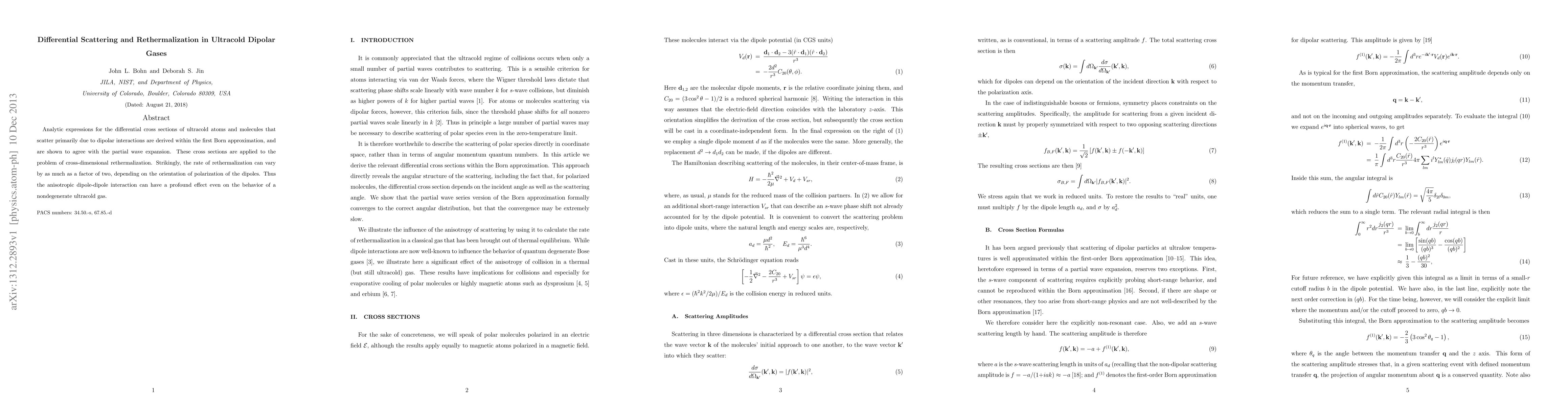 Analytic expressions for the differential cross sections of ultracold atoms and molecules that scatter primarily due to dipolar interactions are derived within the first Born approximation, and are shown to agree with the partial wave expansion. These cross sections are applied to the problem of cross-dimensional rethermalization. Strikingly, the rate of rethermalization can vary by as much as a factor of two, depending on the orientation of polarization of the dipoles. Thus the anisotropic dipole-dipole interaction can have a profound effect even on the behavior of a nondegenerate ultracold gas.