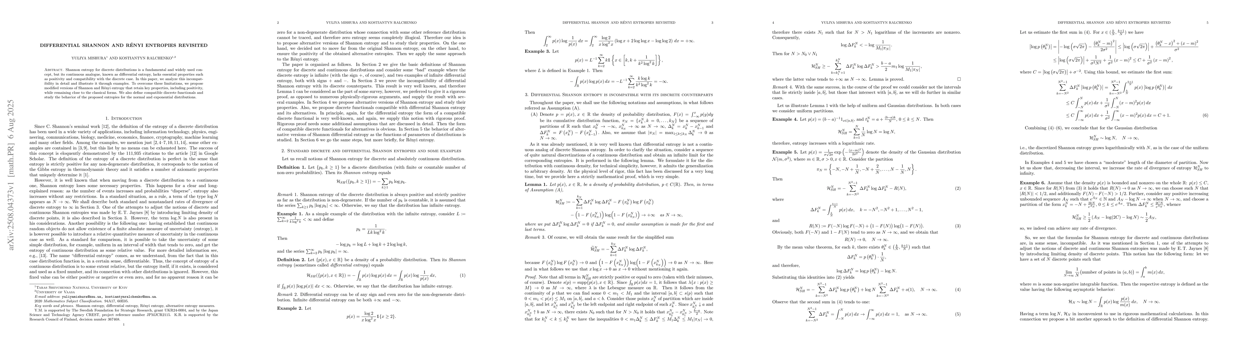 Shannon entropy for discrete distributions is a fundamental and widely used concept, but its continuous analogue, known as differential entropy, lacks essential properties such as positivity and compatibility with the discrete case. In this paper, we analyze this incompatibility in detail and illustrate it through examples. To overcome these limitations, we propose modified versions of Shannon and R\'enyi entropy that retain key properties, including positivity, while remaining close to the classical forms. We also define compatible discrete functionals and study the behavior of the proposed entropies for the normal and exponential distributions.