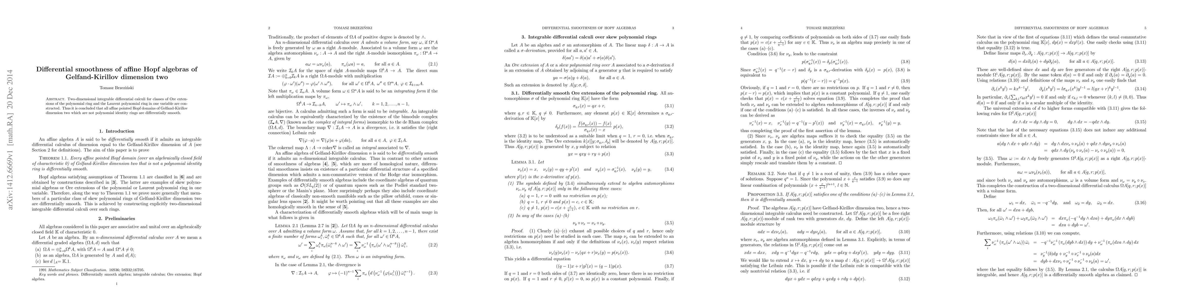 Summary: This paper constructs two-dimensional integrable differential calculi for specific Ore extensions, proving that all affine pointed Hopf domains of Gelfand-Kirillov dimension two, excluding polynomial identity rings, are differentially smooth.