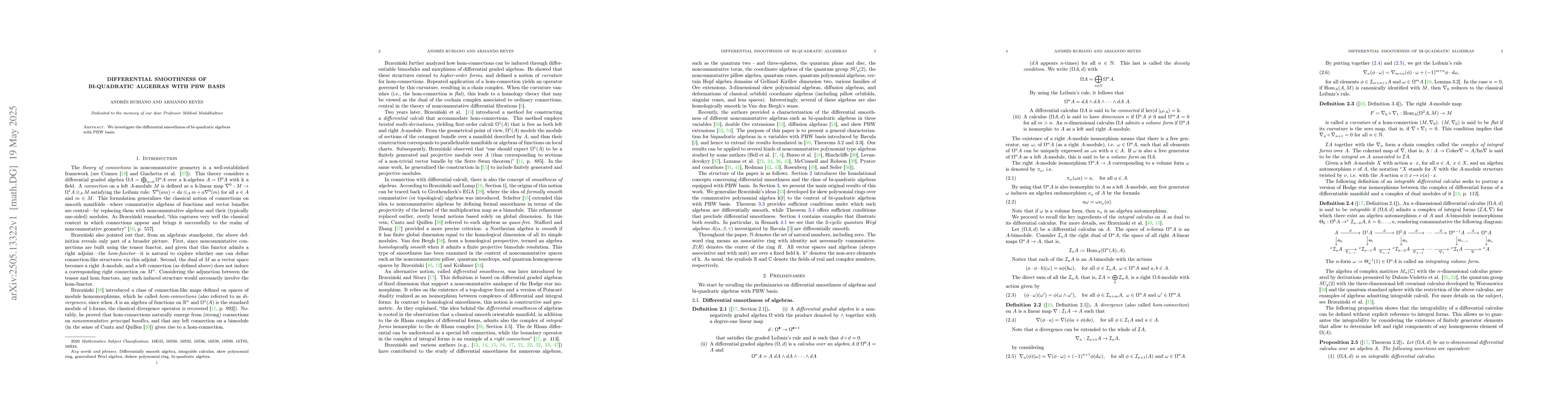 The research employs algebraic techniques to study the differential smoothness of bi-quadratic algebras with PBW (Poincaré-Birkhoff-Witt) basis, focusing on their structural properties and utilizing category theory and homological algebra.