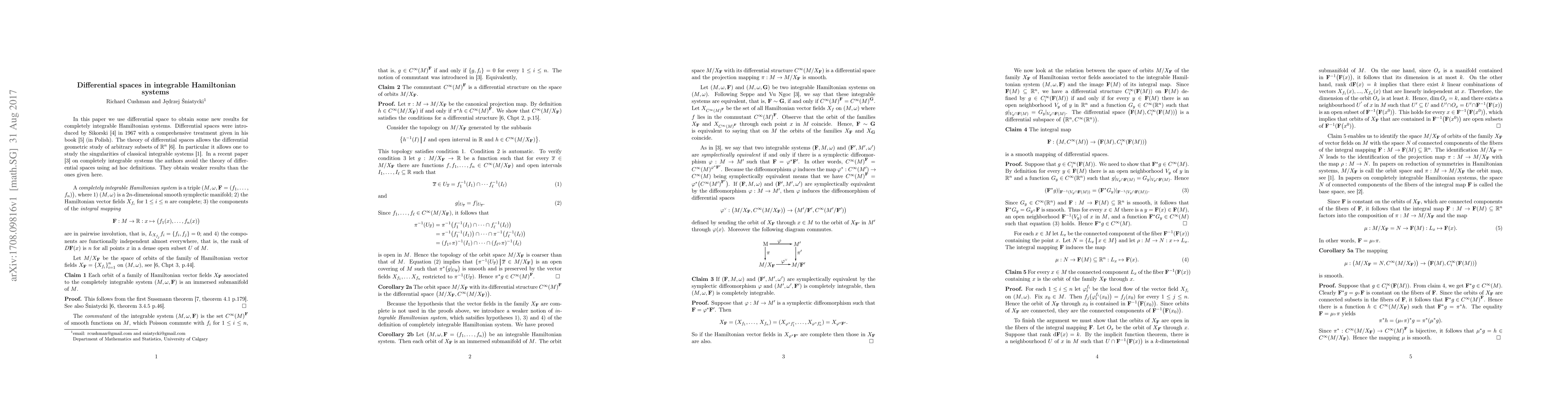 Summary: This paper introduces differential spaces to derive novel findings in integrable Hamiltonian systems, enhancing the understanding of their underlying structures.