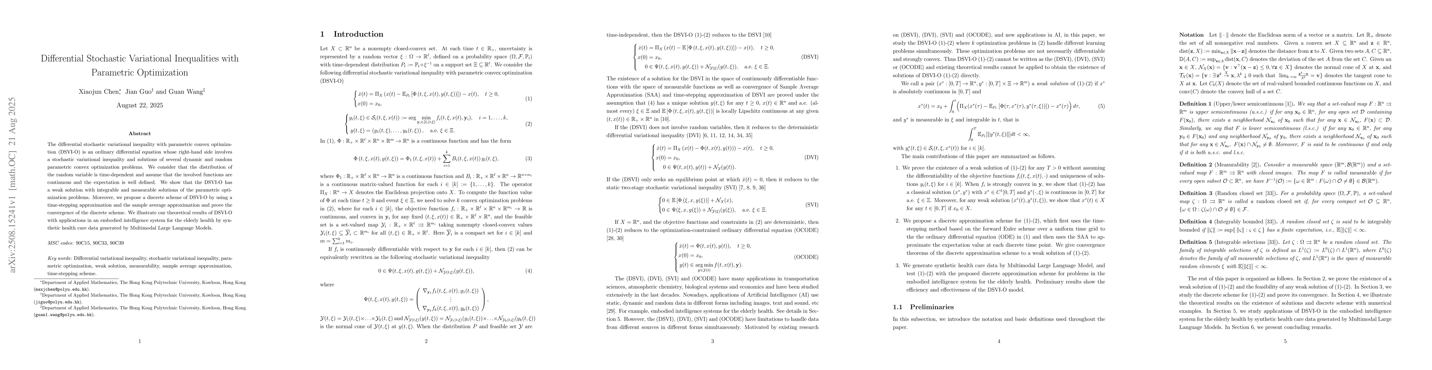 The differential stochastic variational inequality with parametric convex optimization (DSVI-O) is an ordinary differential equation whose right-hand side involves a stochastic variational inequality and solutions of several dynamic and random parametric convex optimization problems. We consider that the distribution of the random variable is time-dependent and assume that the involved functions are continuous and the expectation is well-defined. We show that the DSVI-O has a weak solution with integrable and measurable solutions of the parametric optimization problems. Moreover, we propose a discrete scheme of DSVI-O by using a time-stepping approximation and the sample average approximation and prove the convergence of the discrete scheme. We illustrate our theoretical results of DSVI-O with applications in an embodied intelligence system for the elderly health by synthetic health care data generated by Multimodal Large Language Models.