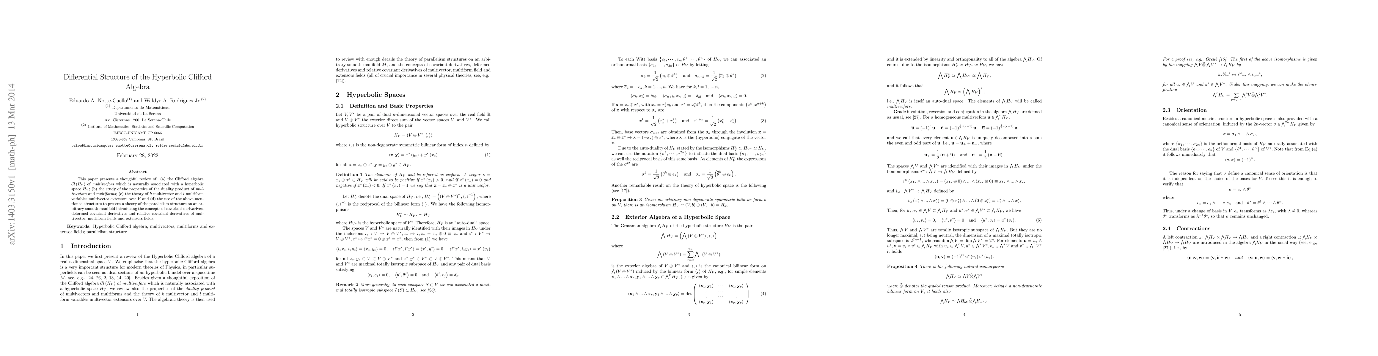 This paper reviews the Clifford algebra Cl(H_{V}) associated with hyperbolic space, explores the duality product of multivectors and multiforms, and introduces multivector extensors. It also develops a theory of parallelism on smooth manifolds using covariant derivatives and their deformations.