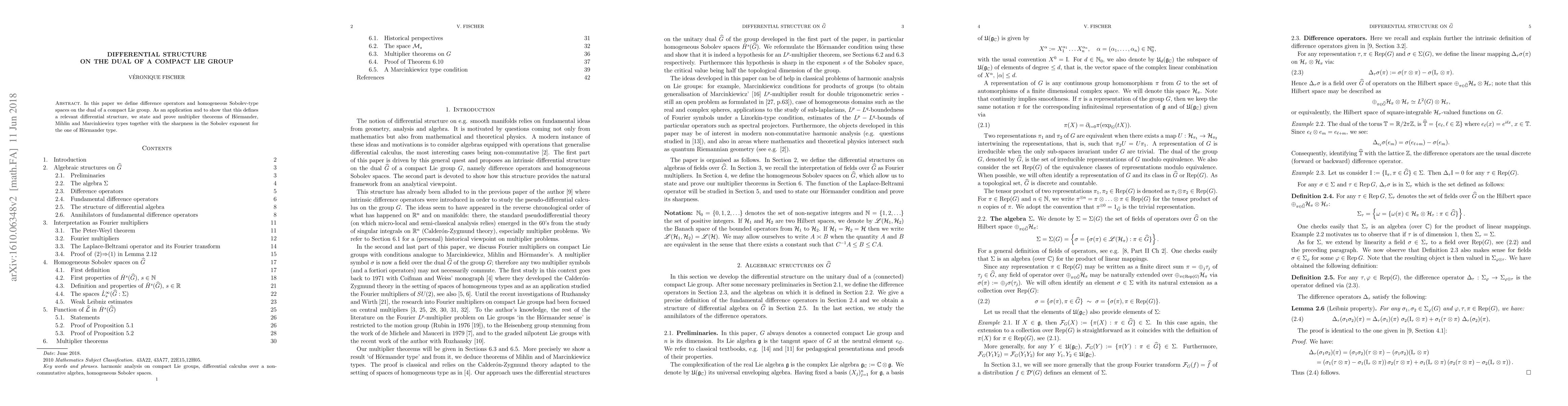 In this paper we define difference operators and homogeneous Sobolev-type spaces on the dual of a compact Lie group. As an application and to show that this defines a relevant differential structure, we state and prove multiplier theorems of H\"ormander, Mihlin and Marcinkiewicz types together with the sharpness in the Sobolev exponent for the one of H\"ormander type.