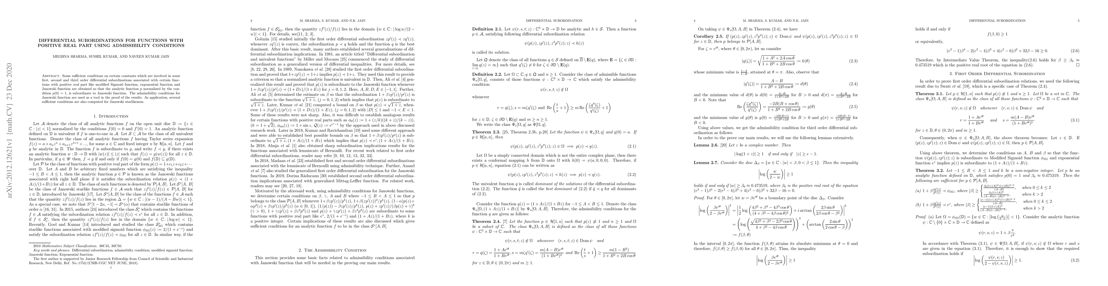 Some sufficient conditions on certain constants which are involved in some first, second and third order differential subordinations associated with certain functions with positive real part like modified Sigmoid function, exponential function and Janowski function are obtained so that the analytic function p normalized by the condition p(0) = 1, is subordinate to Janowski function. The admissibility conditions for Janowski function are used as a tool in the proof of the results. As application, several sufficient conditions are also computed for Janowski starlikeness.