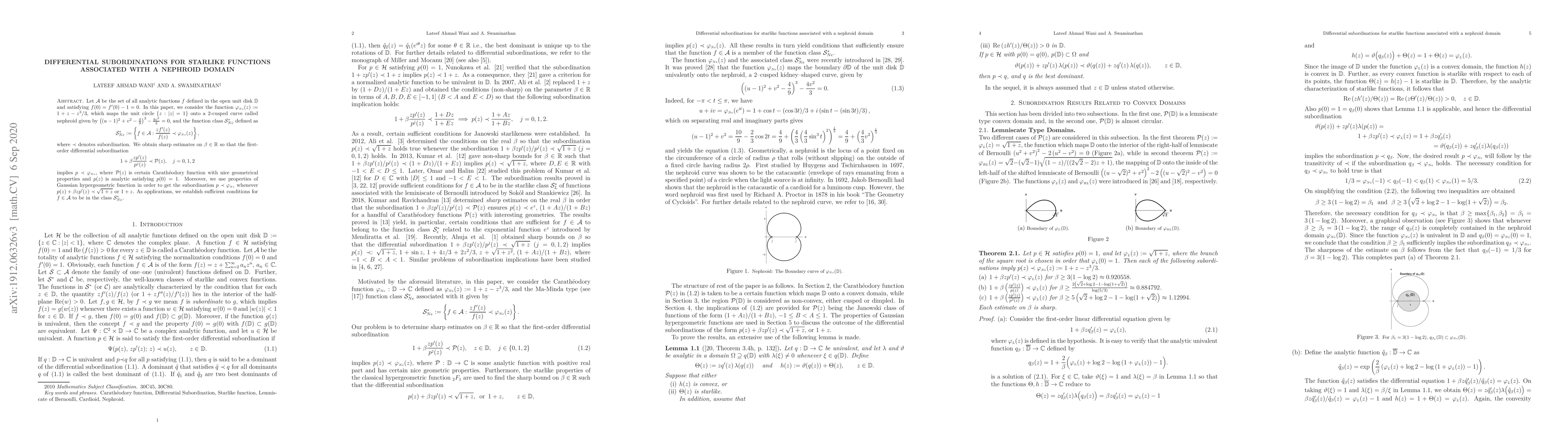 Let $\mathcal{A}$ be the set of all analytic functions $f$ defined in the open unit disk $\mathbb{D}$ and satisfying $f(0)=f'(0)-1=0$. In this paper, we consider the function $\varphi_{\scriptscriptstyle {Ne}}(z):=1+z-z^3/3$, which maps the unit circle $\{z:|z|=1\}$ onto a $2$-cusped curve called nephroid given by $\left((u-1)^2+v^2-\frac{4}{9}\right)^3-\frac{4 v^2}{3}=0$, and the function class $\mathcal{S}^*_{Ne}$ defined as \begin{align*} \mathcal{S}^*_{Ne}:=\left\{f\in\mathcal{A}:\frac{zf'(z)}{f(z)}\prec\varphi_{\scriptscriptstyle {Ne}}(z)\right\}, \end{align*} where $\prec$ denotes subordination. We obtain sharp estimates on $\beta\in\mathbb{R}$ so that the first-order differential subordination \begin{align*} 1+\beta\frac{zp'(z)}{p^j(z)}\prec\mathcal{P}(z), \quad j=0,1,2 \end{align*} implies $p\prec\varphi_{\scriptscriptstyle{Ne}}$, where $\mathcal{P}(z)$ is certain Carath\'{e}odory function with nice geometrical properties and $p(z)$ is analytic satisfying $p(0)=1$. Moreover, we use properties of Gaussian hypergeometric function in order to get the subordination $p\prec\varphi_{\scriptscriptstyle{Ne}}$ whenever $p(z)+\beta zp'(z)\prec\sqrt{1+z}$ or $1+z$. As applications, we establish sufficient conditions for $f\in\mathcal{A}$ to be in the class $\mathcal{S}^*_{Ne}$.