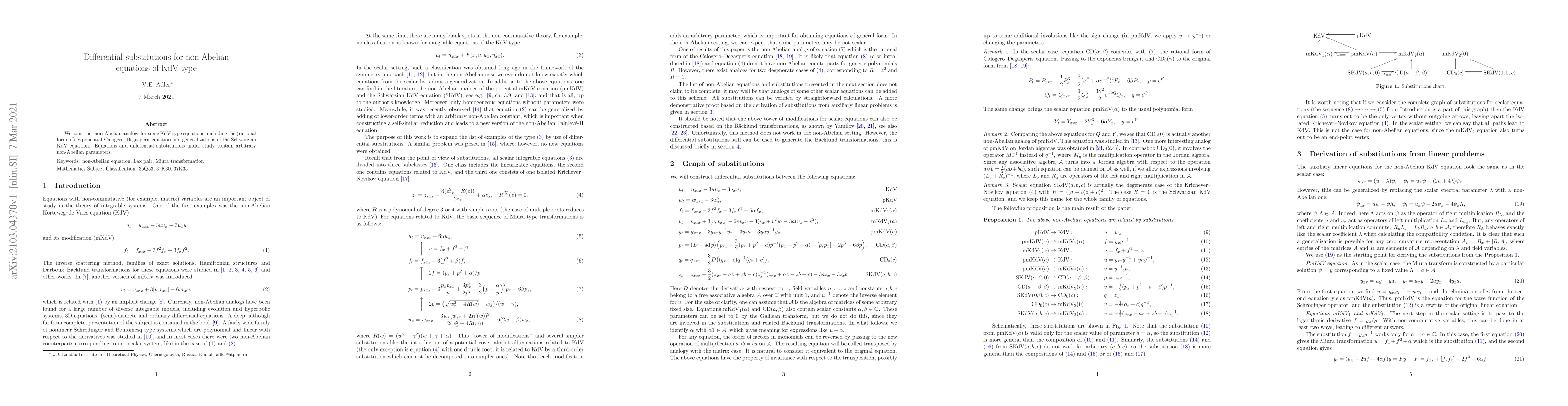 This paper constructs non-Abelian analogs of KdV type equations, including the exponential Calogero-Degasperis equation and generalized Schwarzian KdV equations, utilizing differential substitutions with arbitrary non-Abelian parameters.