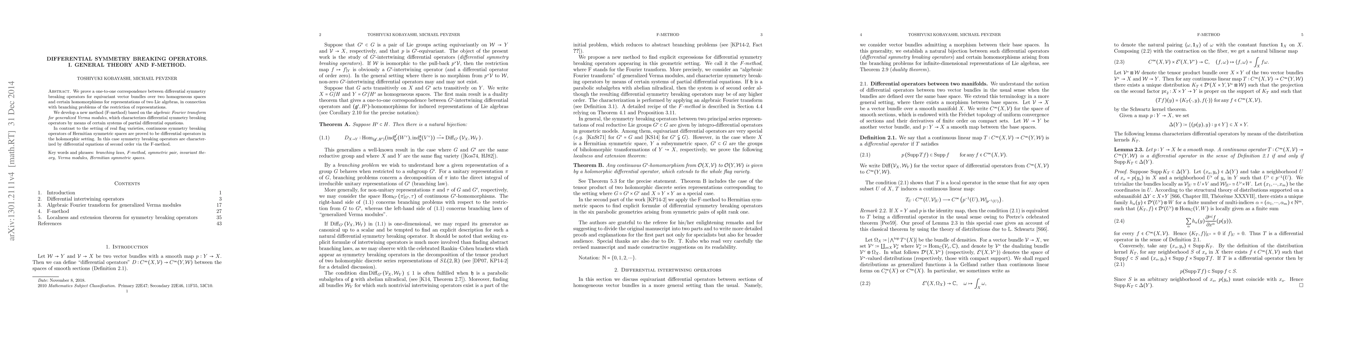 Part I. We prove a one-to-one correspondence between differential symmetry breaking operators for equivariant vector bundles over two homogeneous spaces and certain homomorphisms for representations of two Lie algebras, in connection with branching problems of the restriction of representations. We develop a new method (F-method) based on the algebraic Fourier transform for generalized Verma modules, which characterizes differential symmetry breaking operators by means of certain systems of partial differential equations. In contrast to the setting of real flag varieties, continuous symmetry breaking operators of Hermitian symmetric spaces are proved to be differential operators in the holomorphic setting. In this case symmetry breaking operators are characterized by differential equations of second order via the F-method. Part II. Rankin--Cohen brackets are symmetry breaking operators for the tensor product of two holomorphic discrete series representations of SL(2,R). We address a general problem to find explicit formulae for such intertwining operatorsin the setting of multiplicity-free branching laws for reductive symmetric pairs. We discover explicit formulae of new differential symmetry breaking operators for all the six different complex geometries arising from semisimple symmetric pairs of split rank one, and reveal an intrinsic reason why the coefficients of orthogonal polynomials appear in these operators (Rankin--Cohen type) in the three geometries and why normal derivatives are symmetry breaking operators in the other three cases. Further, we analyze a new phenomenon that the multiplicities in the branching laws of Verma modules may jump up at singular parameters.