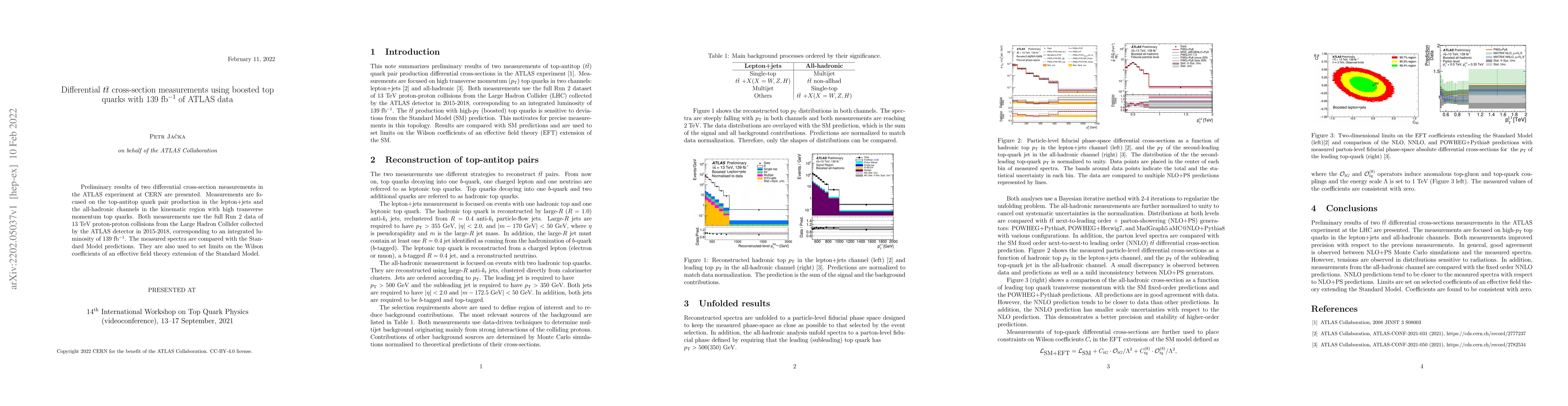 Preliminary results of two differential cross-section measurements in the ATLAS experiment at CERN are presented. Measurements are focused on the top-antitop quark pair production in the~lepton+jets and the~all-hadronic channels in the kinematic region with high transverse momentum top quarks. Both measurements use the full Run 2 data of 13 TeV proton-proton collisions from the Large Hadron Collider collected by the ATLAS detector in 2015-2018, corresponding to an integrated luminosity of 139 fb$^{-1}$. The measured spectra are compared with the Standard Model predictions. They are also used to set limits on the Wilson coefficients of an effective field theory extension of the Standard Model.