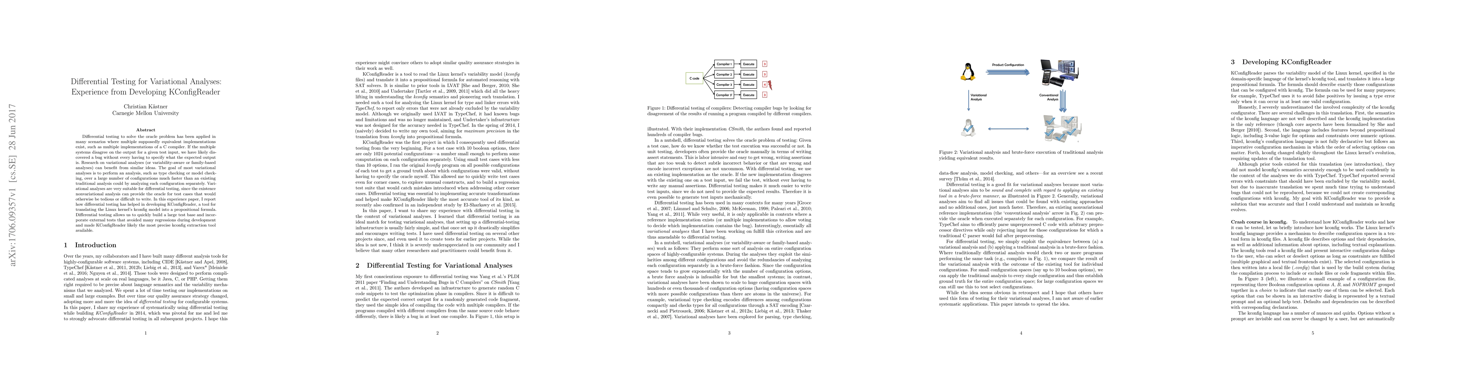 The paper discusses the application of differential testing in variational analyses, using the development of KConfigReader as an example. Differential testing, which compares multiple implementations for discrepancies, was instrumental in building a comprehensive test suite for KConfigReader, a tool translating Linux kernel's kconfig model. This method swiftly identified regressions and improved precision, making KConfigReader a leading kconfig extraction tool.