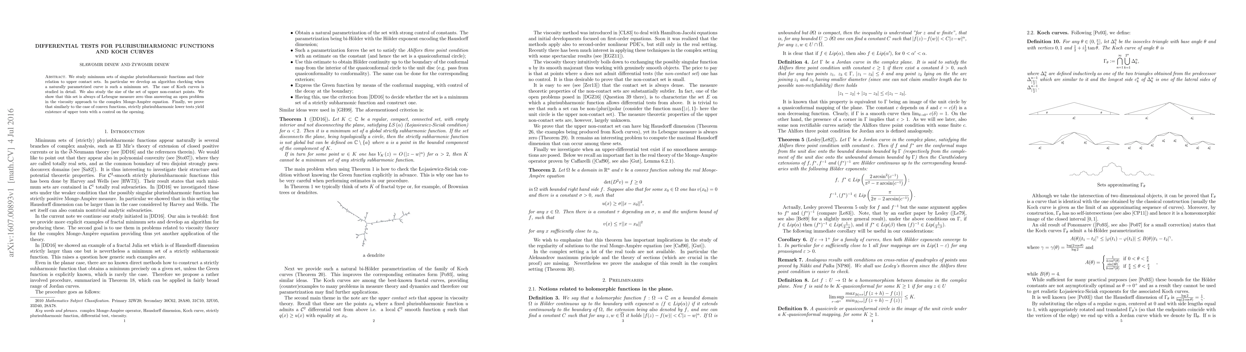 This paper develops a method to determine if a parametrized curve is a minimum set of singular plurisubharmonic functions, focusing on the case of Koch curves. It proves that the set of upper non-contact points has Lebesgue measure zero, resolving an open question in the viscosity approach to the complex Monge-Ampère equation.