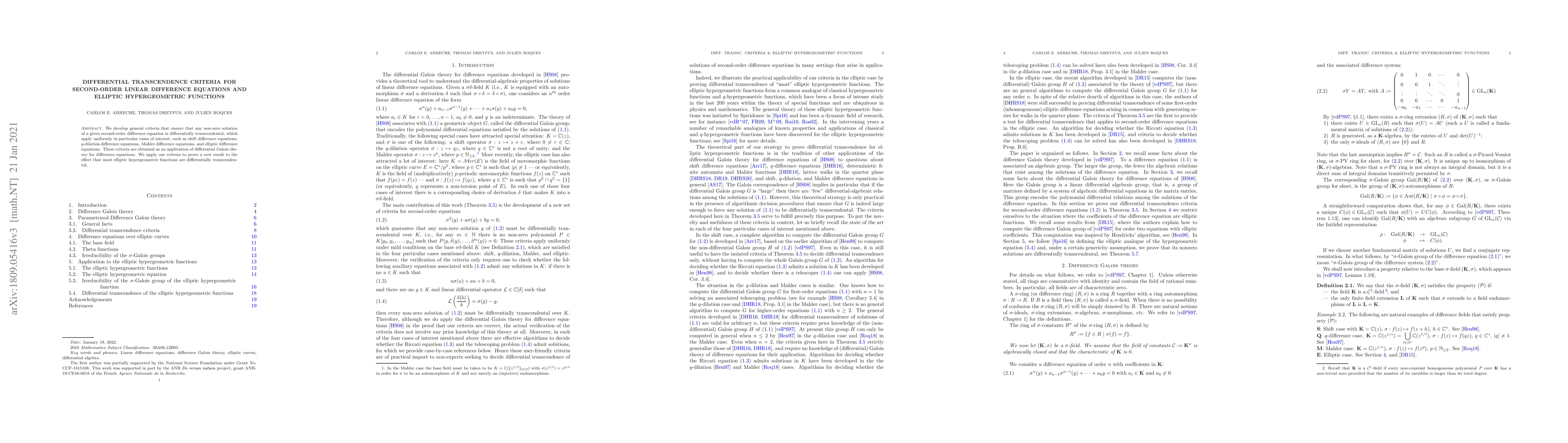 We develop general criteria that ensure that any non-zero solution of a given second-order difference equation is differentially transcendental, which apply uniformly in particular cases of interest, such as shift difference equations, q-dilation difference equations, Mahler difference equations, and elliptic difference equations. These criteria are obtained as an application of differential Galois theory for difference equations. We apply our criteria to prove a new result to the effect that most elliptic hypergeometric functions are differentially transcendental.