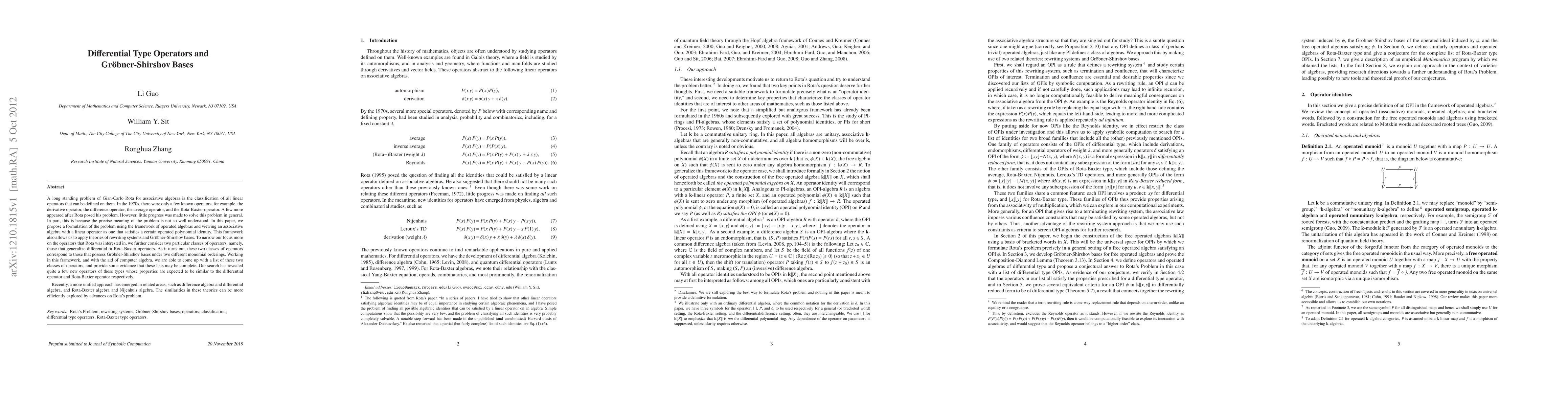 This paper addresses Gian-Carlo Rota's longstanding problem of classifying linear operators on associative algebras by introducing a framework using operated algebras and Gr\"obner-Shirshov bases. It identifies new classes of differential and Rota-Baxter-like operators and suggests these lists may be complete, aided by computer algebra.
