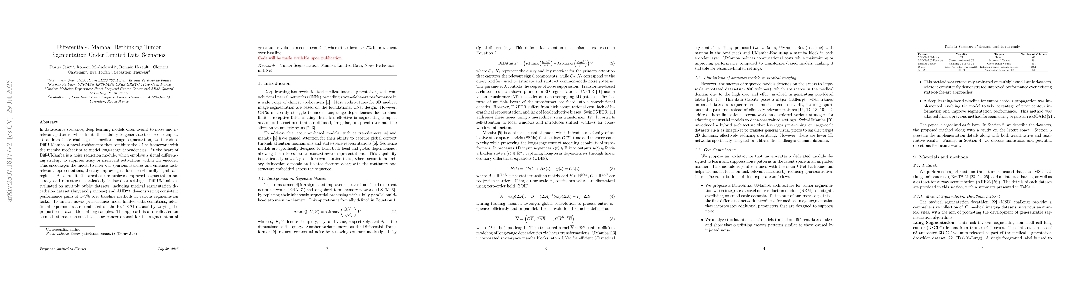In data-scarce scenarios, deep learning models often overfit to noise and irrelevant patterns, which limits their ability to generalize to unseen samples. To address these challenges in medical image segmentation, we introduce Diff-UMamba, a novel architecture that combines the UNet framework with the mamba mechanism for modeling long-range dependencies. At the heart of Diff-UMamba is a Noise Reduction Module (NRM), which employs a signal differencing strategy to suppress noisy or irrelevant activations within the encoder. This encourages the model to filter out spurious features and enhance task-relevant representations, thereby improving its focus on clinically meaningful regions. As a result, the architecture achieves improved segmentation accuracy and robustness, particularly in low-data settings. Diff-UMamba is evaluated on multiple public datasets, including MSD (lung and pancreas) and AIIB23, demonstrating consistent performance gains of 1-3% over baseline methods across diverse segmentation tasks. To further assess performance under limited-data conditions, additional experiments are conducted on the BraTS-21 dataset by varying the proportion of available training samples. The approach is also validated on a small internal non-small cell lung cancer (NSCLC) dataset for gross tumor volume (GTV) segmentation in cone beam CT (CBCT), where it achieves a 4-5% improvement over the baseline.