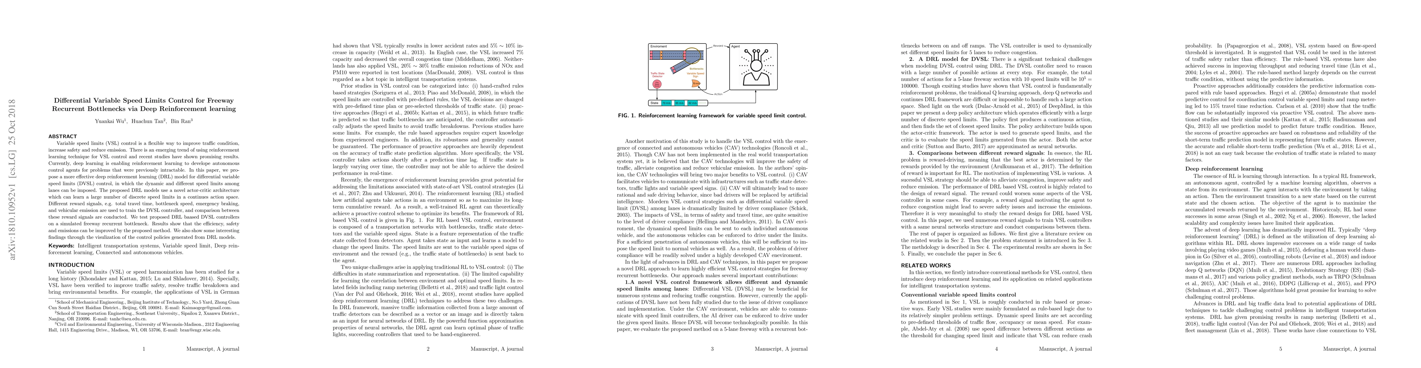 This paper proposes a deep reinforcement learning model for differential variable speed limits (DVSL) control to improve traffic efficiency, safety, and reduce emissions at freeway bottlenecks. The model uses an actor-critic architecture to learn dynamic speed limits across lanes, optimizing various reward signals, and demonstrates improved outcomes in a simulated environment.