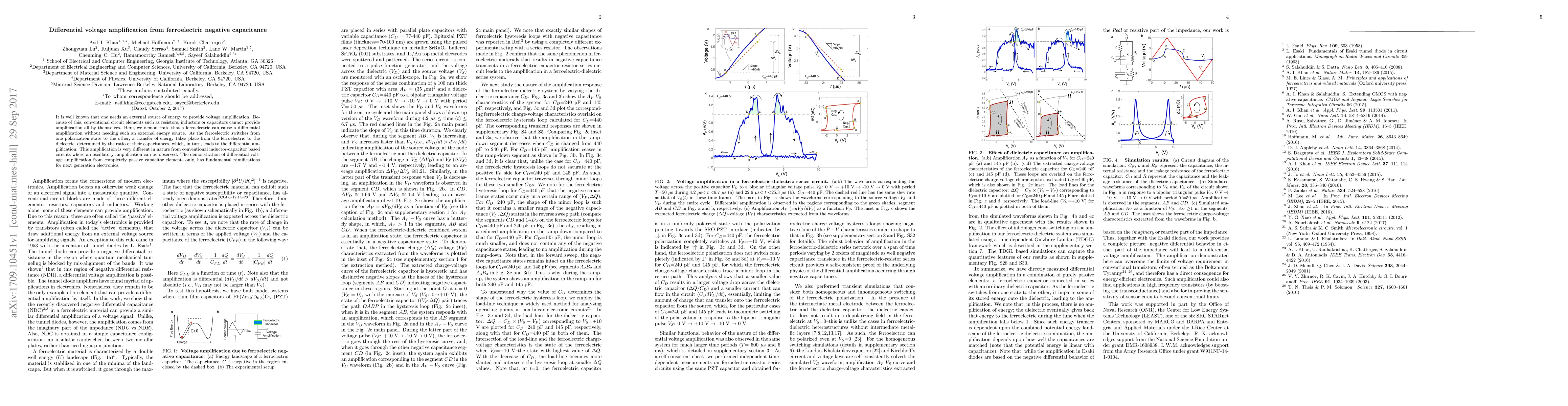 It is well known that one needs an external source of energy to provide voltage amplification. Because of this, conventional circuit elements such as resistors, inductors or capacitors cannot provide amplification all by themselves. Here, we demonstrate that a ferroelectric can cause a differential amplification without needing such an external energy source. As the ferroelectric switches from one polarization state to the other, a transfer of energy takes place from the ferroelectric to the dielectric, determined by the ratio of their capacitances, which, in turn, leads to the differential amplification. {This amplification is very different in nature from conventional inductor-capacitor based circuits where an oscillatory amplification can be observed. The demonstration of differential voltage amplification from completely passive capacitor elements only, has fundamental ramifications for next generation electronics.