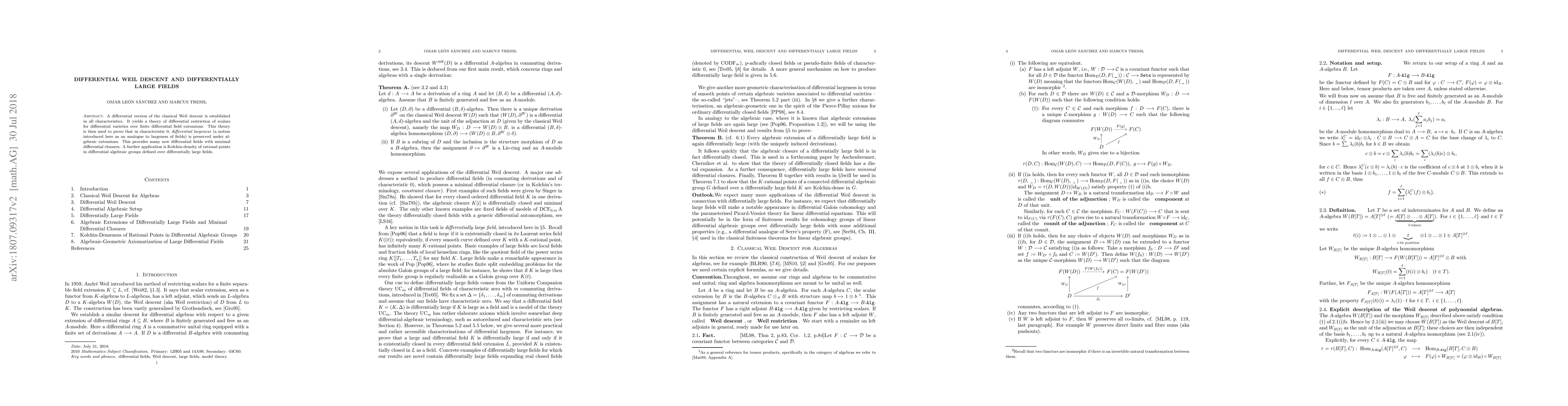 This paper establishes a differential version of Weil descent, providing a theory for differential restriction of scalars in finite differential field extensions. It proves that differential largeness in characteristic 0 is preserved under algebraic extensions, leading to new minimal differential closures and Kolchin-density of rational points in differential algebraic groups.