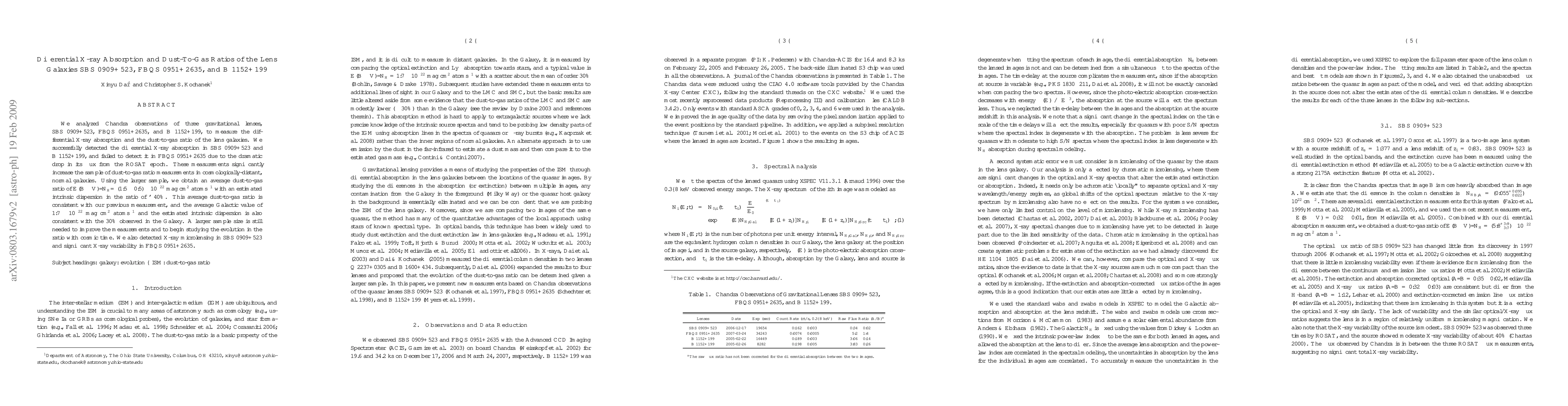 This study analyzed Chandra observations of three gravitational lenses to measure differential X-ray absorption and dust-to-gas ratios, finding absorption in two and no detection in the third due to flux drop. The research yields an average dust-to-gas ratio consistent with the Galactic value and suggests a need for a larger sample to study cosmic evolution.