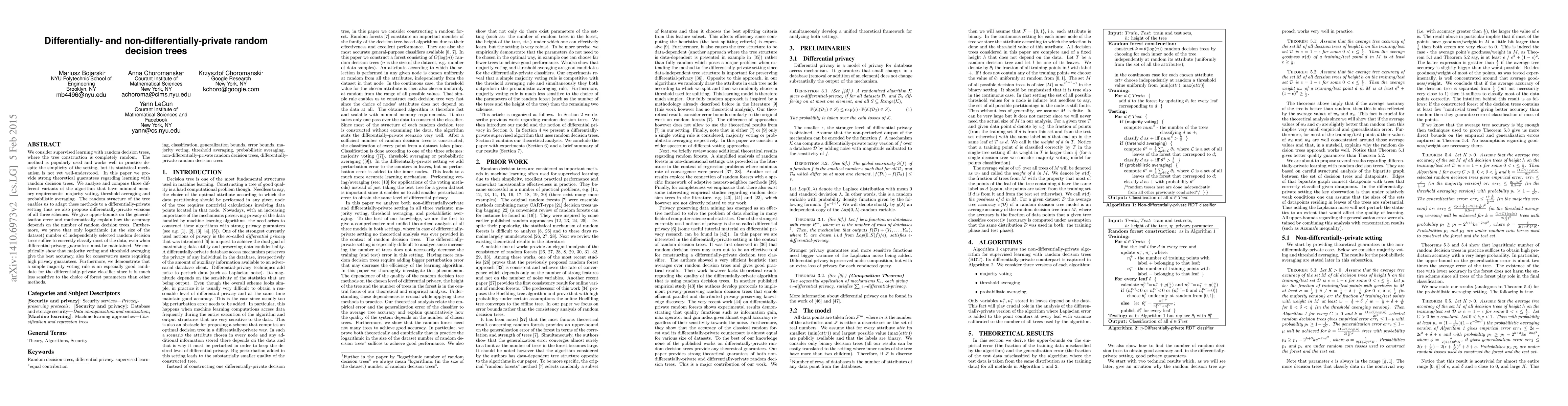 This paper investigates supervised learning with random decision trees, providing theoretical guarantees for three variants: majority voting, threshold averaging, and probabilistic averaging. It introduces differentially-private versions of these methods, proving that a logarithmic number of trees suffices for accurate classification while maintaining privacy. Empirically, majority voting and threshold averaging show the best accuracy, with majority voting being particularly robust to parameter choices.