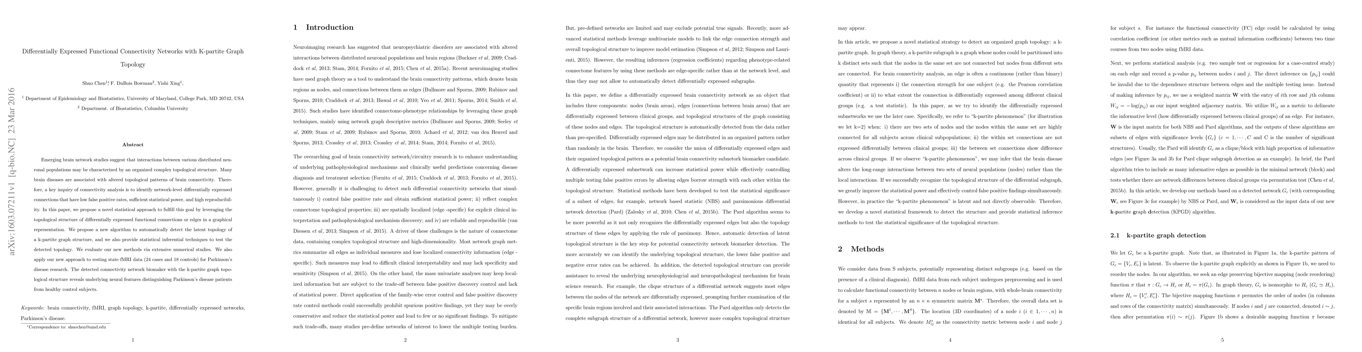 Emerging brain network studies suggest that interactions between various distributed neuronal populations may be characterized by an organized complex topological structure. Many brain diseases are associated with altered topological patterns of brain connectivity. Therefore, a key inquiry of connectivity analysis is to identify network-level differentially expressed connections that have low false positive rates, sufficient statistical power, and high reproducibility. In this paper, we propose a novel statistical approach to fulfill this goal by leveraging the topological structure of differentially expressed functional connections or edges in a graphical representation. We propose a new algorithm to automatically detect the latent topology of a k-partite graph structure, and we also provide statistical inferential techniques to test the detected topology. We evaluate our new methods via extensive numerical studies. We also apply our new approach to resting state fMRI data (24 cases and 18 controls) for Parkinson's disease research. The detected connectivity network biomaker with the k-partite graph topological structure reveals underlying neural features distinguishing Parkinson's disease patients from healthy control subjects.