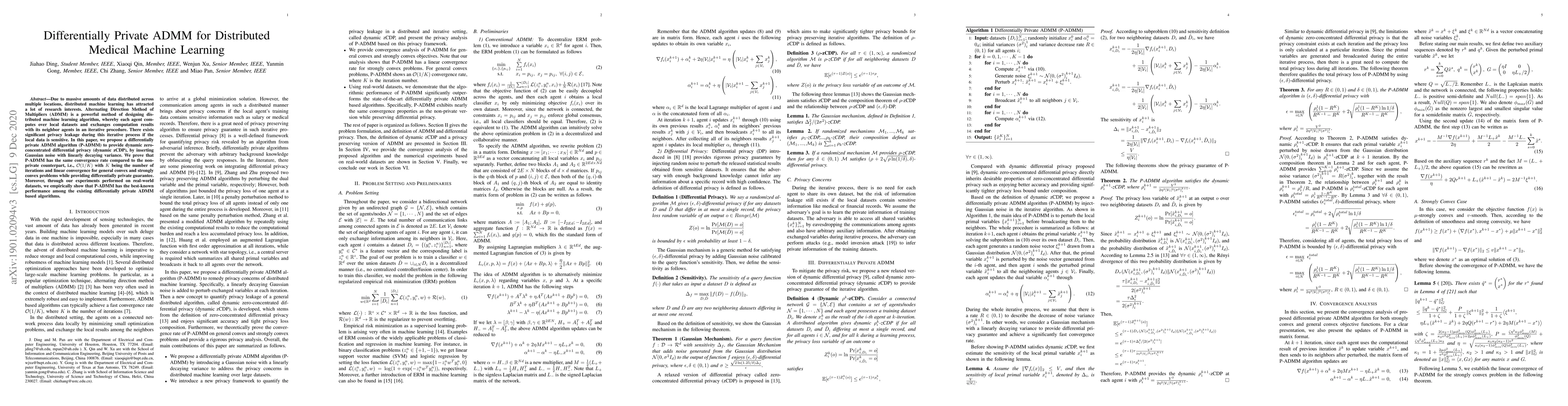 This paper introduces a differentially private version of the Alternating Direction Method of Multipliers (ADMM) for distributed medical machine learning, offering dynamic zero-concentrated differential privacy. The proposed P-ADMM algorithm maintains the convergence rate of the original ADMM while providing privacy guarantees and outperforming existing differentially private ADMM methods in empirical tests.