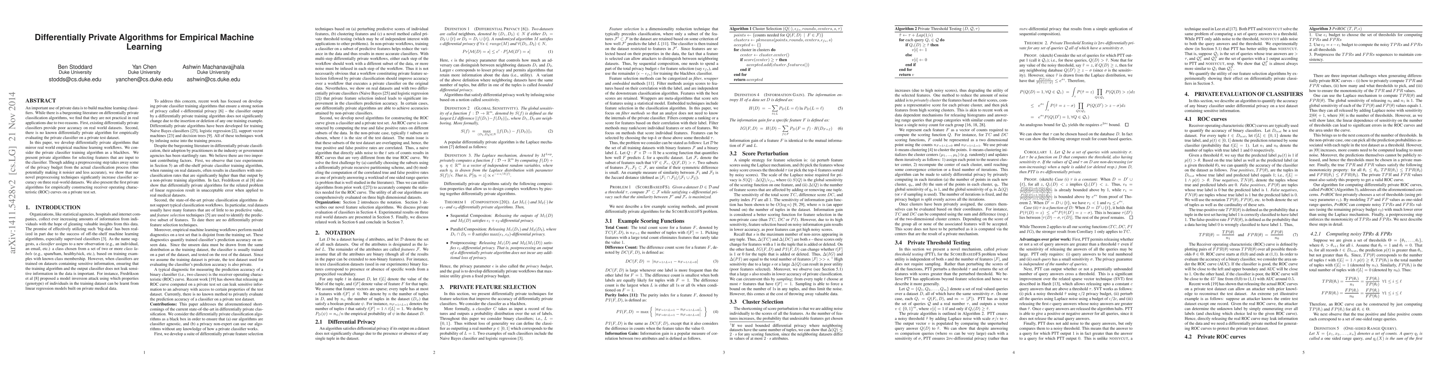An important use of private data is to build machine learning classifiers. While there is a burgeoning literature on differentially private classification algorithms, we find that they are not practical in real applications due to two reasons. First, existing differentially private classifiers provide poor accuracy on real world datasets. Second, there is no known differentially private algorithm for empirically evaluating the private classifier on a private test dataset. In this paper, we develop differentially private algorithms that mirror real world empirical machine learning workflows. We consider the private classifier training algorithm as a blackbox. We present private algorithms for selecting features that are input to the classifier. Though adding a preprocessing step takes away some of the privacy budget from the actual classification process (thus potentially making it noisier and less accurate), we show that our novel preprocessing techniques significantly increase classifier accuracy on three real-world datasets. We also present the first private algorithms for empirically constructing receiver operating characteristic (ROC) curves on a private test set.