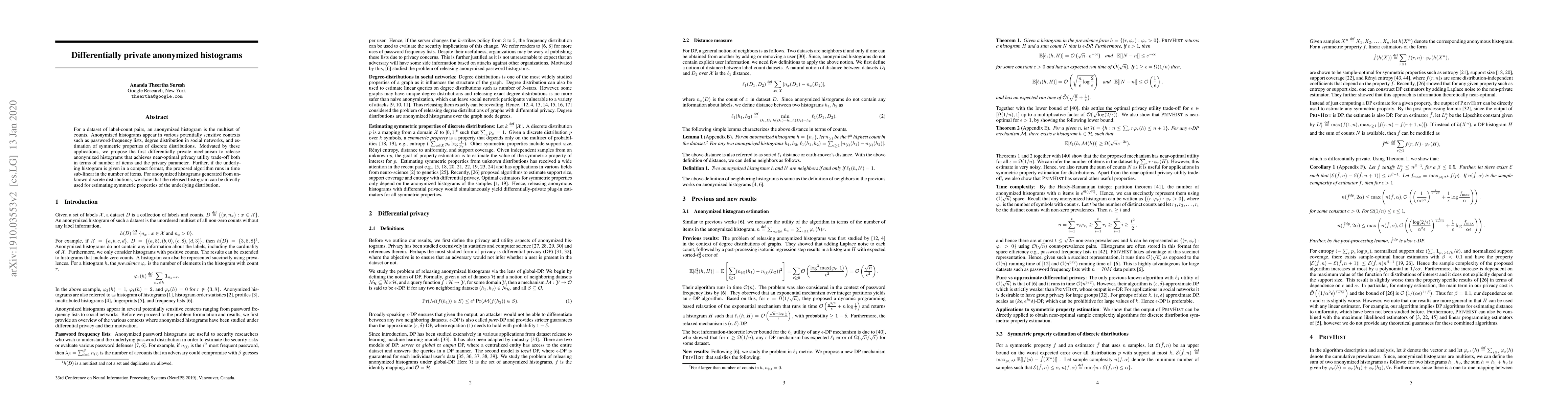 This paper proposes a differentially private mechanism for releasing anonymized histograms, achieving a near-optimal balance between privacy and utility. The method is efficient, running in sub-linear time for compact histograms, and can estimate symmetric properties of unknown discrete distributions.