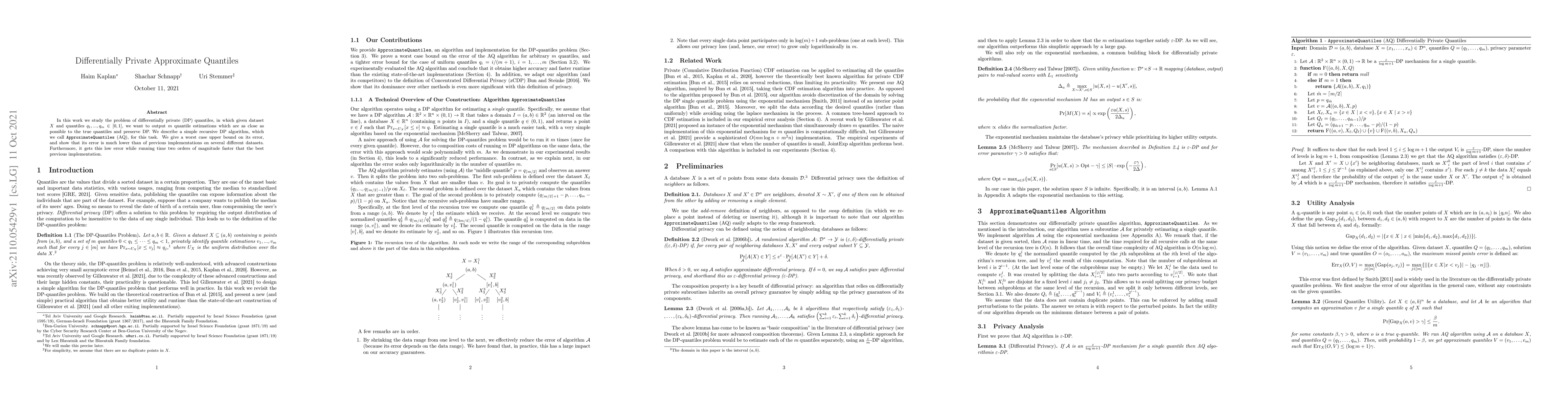 This paper presents a new differentially private algorithm, ApproximateQuantiles (AQ), for estimating quantiles in a dataset while preserving privacy. The AQ algorithm achieves significantly lower error and runs two orders of magnitude faster than previous methods.