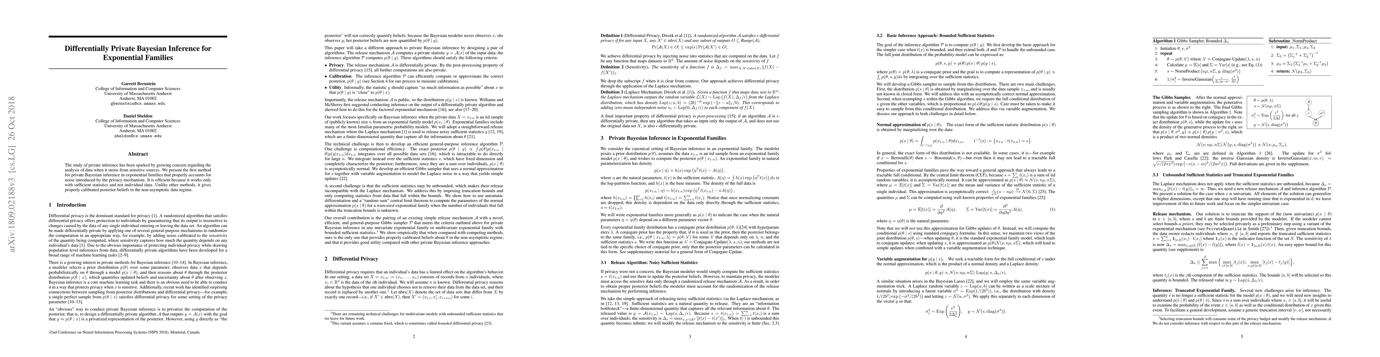 This paper introduces a method for private Bayesian inference in exponential families that maintains efficient computation using sufficient statistics, allowing for accurate posterior beliefs even in non-asymptotic data regimes.